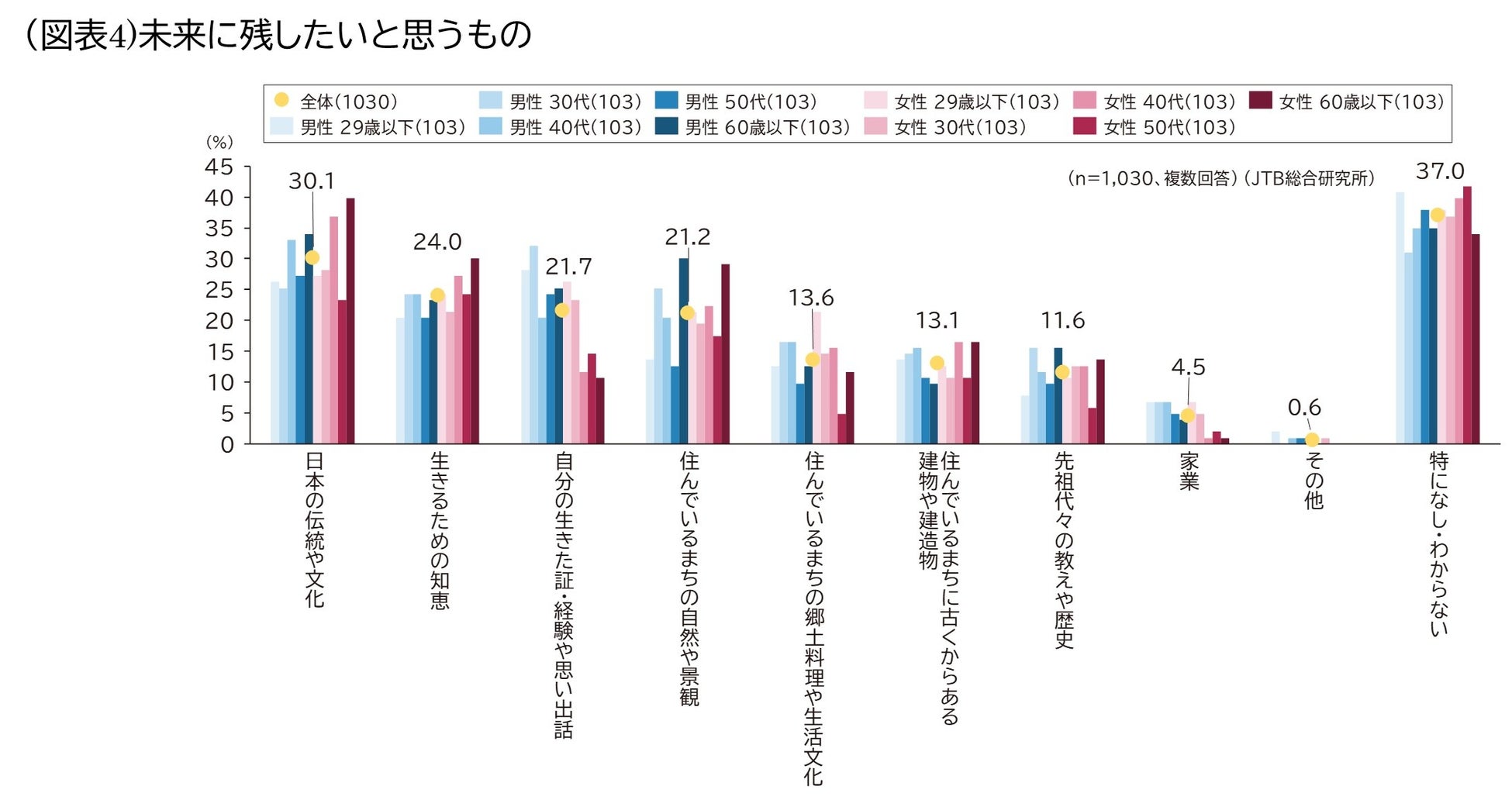 未来に残したいと思うものについては、「自分の生きた証・経験や思い出話」が、男性30代(32.0%)、男性29歳以下(28.2%)、女性29歳以下(26.2自分の何かを残したいという考えが特徴となりました(図表4)。