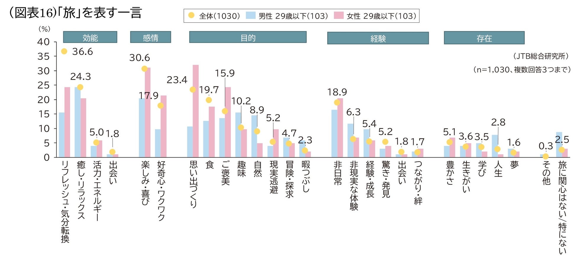 また「旅」を表す一言については、全体では「リフレッシュ・気分転換(36.6%)」、「楽しみ・喜び(30.6%)」、「癒し・リラックス(24.3%)」、「思い出づくり(23.4%)」、「食(19.7%)」となり、「食」以外は女性の方が高い結果となりました。男性29歳以下で全体より特に高い項目としては、「趣味(15.5%)」、「自然(14.6%)」、「非現実な体験(11.7%)」が他の属性に比べて高く、逆に「リフレッシュ・気分転換(15.5%)」、「思い出づくり(10.7%)」は平均の半分以下となりました。女性29歳以下では「思い出づくり(32.0%)」、「ご褒美(24.3%)」が全体より高い一方で、「リフレッシュ・気分転換(24.3%)」は男性29歳以下に次いで低い結果となりました(図表16)。