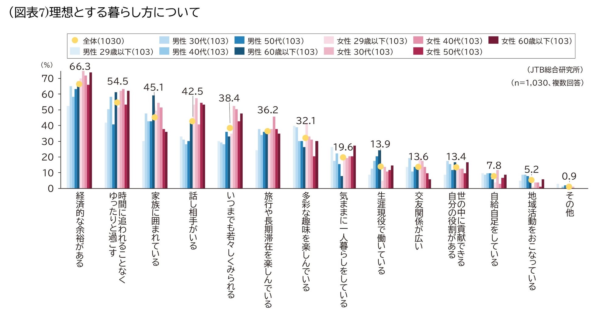 理想とする暮らし方については、男性29歳以下では「多彩な趣味を楽しんでいる(39.8%)」、「気ままに一人暮らしをしている(26.2%)」が平均より高く、「多彩な趣味を楽しんでいる(41.7%)」は女性29歳以下が最も高い結果となりました。また「気ままに一人暮らしをしている」は女性60歳以上が最も高い(27.2%)一方、男性60歳以上は7.8%と最も低く、相反する結果になりました。「話し相手がいる」、「いつまでも若々しくみられる」などの項目でも男女間での差が多い結果となりました(図表7)。