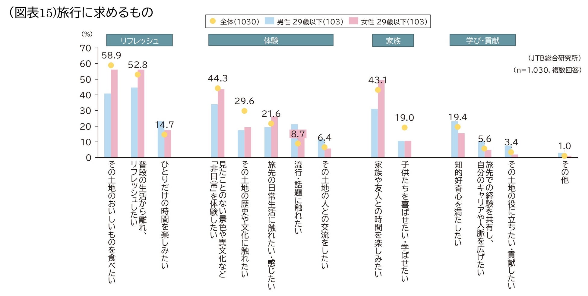 旅に求めるものについては、男性29歳以下で全体より特に高い項目としては、「ひとりだけの時間を楽しみたい(23.3%)」、「流行・話題に触れたい(21.4%)」、「その土地の人との交流をしたい(11.7%)」、「旅先での経験を共有し、自身のキャリアや人脈を広げたい(10.7%)」、女性29歳以下では「家族や友人との時間を楽しみたい(49.5%)」となりました(図表15)。