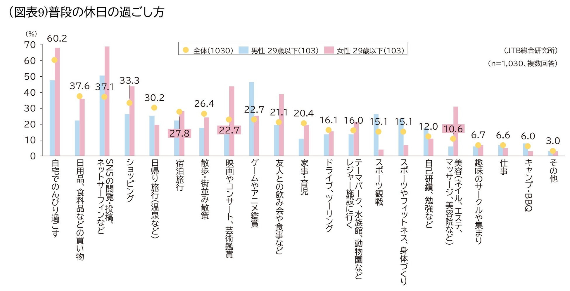 普段の休日の過ごし方については、男性29歳以下は「SNSの閲覧・投稿、ネットサーフィンなど(50.5%)」、「ゲームやアニメ鑑賞(46.6%)」、「スポーツ観戦(26.2%)」の順に高くなりました。女性29歳以下は「SNSの閲覧・投稿、ネットサーフィンなど(68.9%)」、次いで「自宅でのんびりと過ごす (68.0%)」、「ショッピング(43.7%)」、「映画やコンサート、芸術鑑賞(43.7%)」となりました(図表9)。