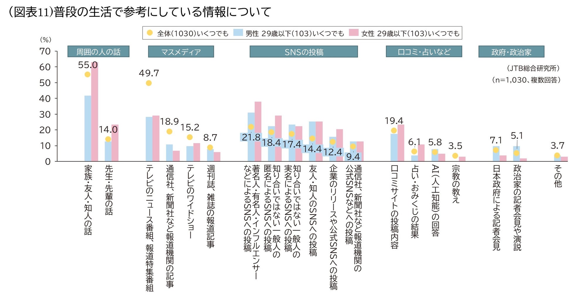 普段の生活で参考にしている情報について聞きました。全体としては上位から「家族・友人・知人の話(55.0%)」、「テレビのニュース番組、報道特集番組(49.7%)」、「著名人・有名人・インフルエンサーなどによるSNSへの投稿(21.8%)」が多く、その中で最も信頼するものを1つ選んだ場合、「家族・友人・知人の話」の割合がさらに高くなりました。それに対し、男女ともに29歳以下では「家族・友人・知人の話」の次が「著名人・有名人・インフルエンサーなどによるSNSへの投稿」となりました。「SNSへの投稿」に関するカテゴリーが他の属性より高い一方で、「テレビのニュース番組、報道特集番組」は全体より20ポイント以上低い結果となりました。Z世代にとっては、SNSの方がニュース番組などよりも信頼できる存在と言えそうです(図表11)。