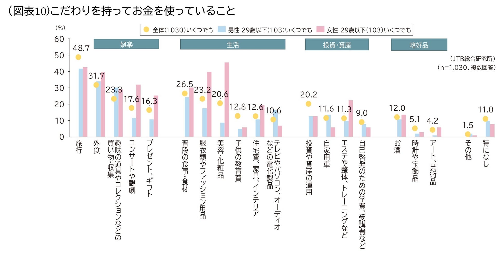 またこだわりを持ってお金を使っていることについては、男性29歳以下は「外食(34.0%)」、「趣味の道具やコレクションなどの買い物・収集(30.1%)」が高く、女性29歳以下は「美容・化粧品(45.6%)」、「服衣類やファッション用品(39.8%)」、「外食(39.8%)」、「コンサートや観劇(32.0%)」が全属性の中で最も高い結果となりました(図表9)。男性29歳以下は、時間もお金も自分の趣味に割く傾向が強くみられます(図表10)。