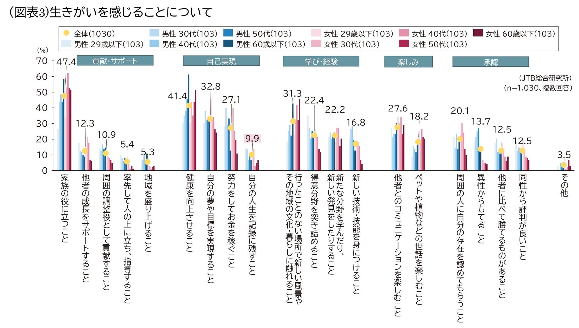 2.生きがいについて、男性29歳以下は「得意分野を突き詰めること」、女性29歳以下は「自分の夢や目標を実現すること」、「周囲の人に自分の存在を認めてもらうこと」、「自分の人生を記録に残すこと」などを重視。未来に残したいものについても、「自分の生きた証・経験や思い出話」など自分に関するものが他の世代より強い