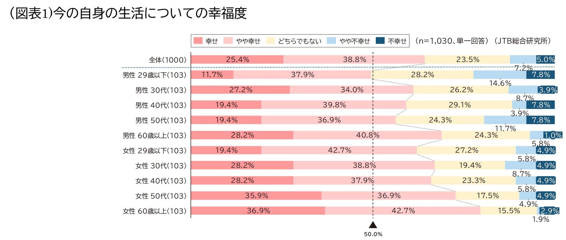 今の自身の生活についての幸福度について聞いたところ、全体として女性の方が男性より高い傾向にあり、性別で見ると男女共に29歳以下が最も低い結果となりました。特に男性29歳以下は「幸せ」+「やや幸せ」の合計が49.5%と、唯一過半数を下回りました(図表1)。