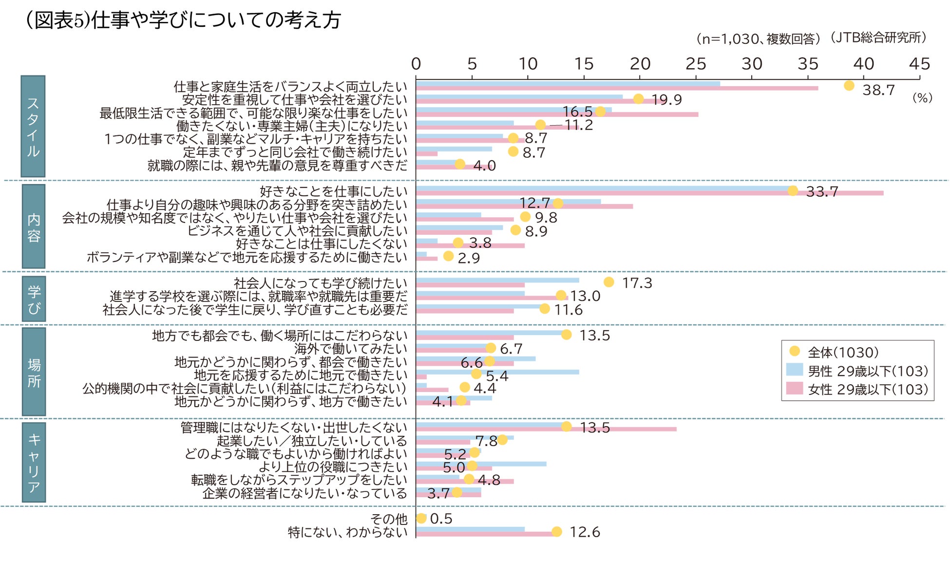 次に仕事や学びについて聞きました。男性29歳以下で全体より高い項目は「地元を応援するために地元で働きたい(14.6%)」、「より上位の役職につきたい(11.7%)」。女性29歳以下では「好きなことを仕事にしたい(41.7%)」、「最低限生活できる範囲で、可能な限り楽な仕事をしたい(25.2%)」、「管理職にはなりたくない・出世したくない(23.3%)」となりました(図表5)。