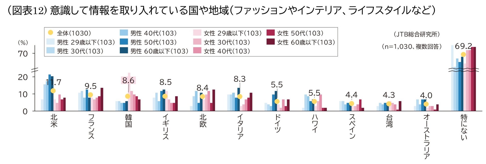 また意識して情報を取り入れている国・地域については、男性29歳以下は「特にない(74.8%)」が最も高かったのに対し、男性50代・60代は北米、女性29歳以下は韓国が高い結果となりました(図表12)。
