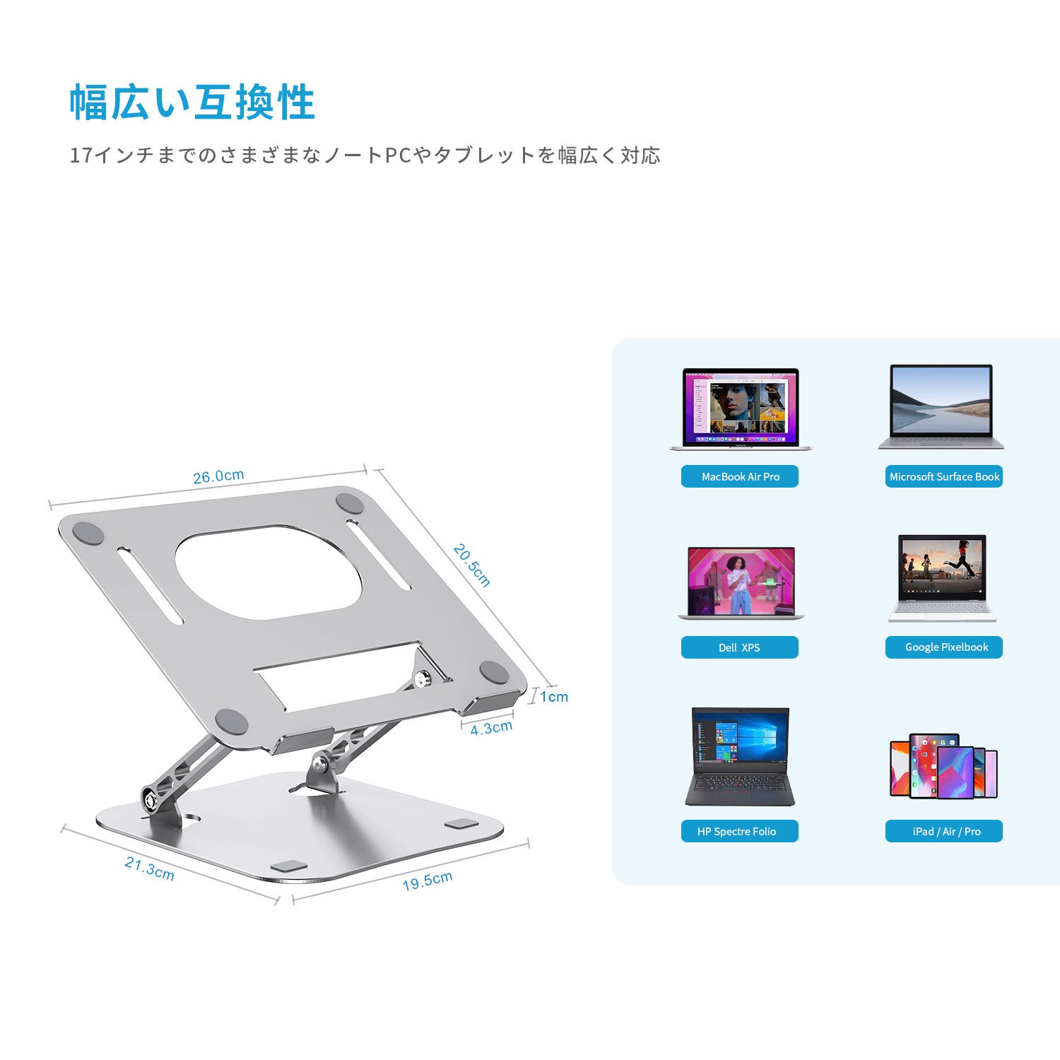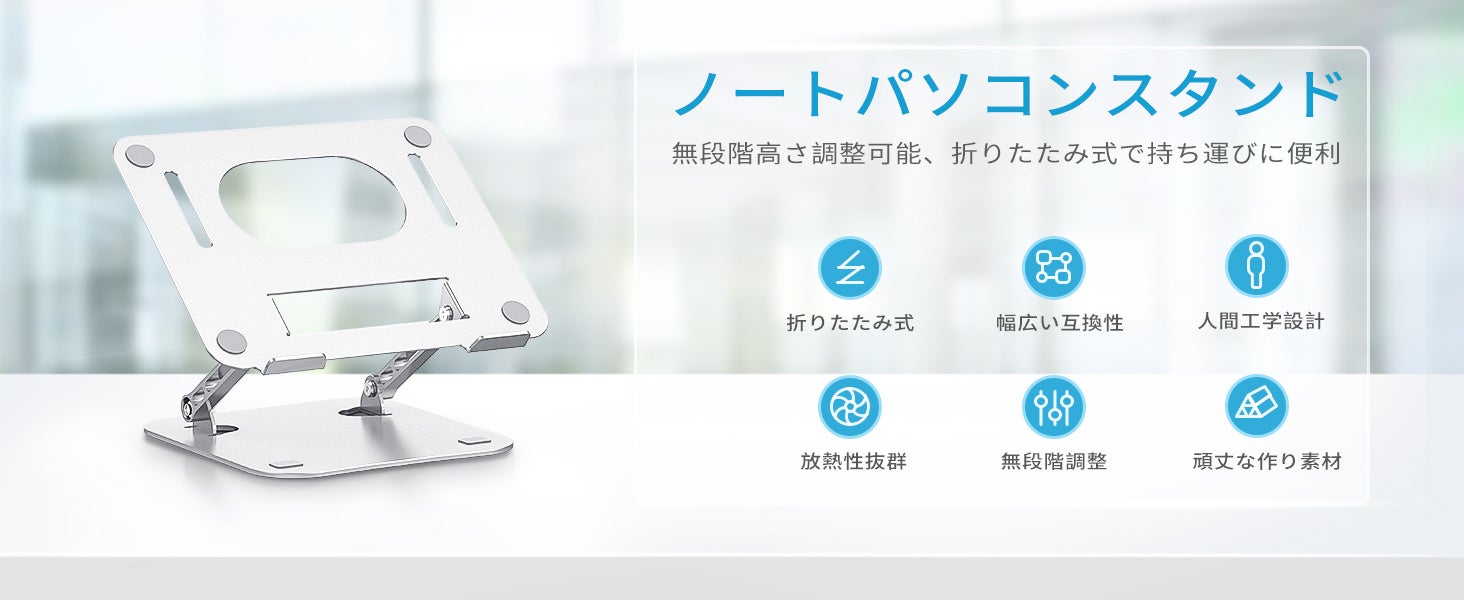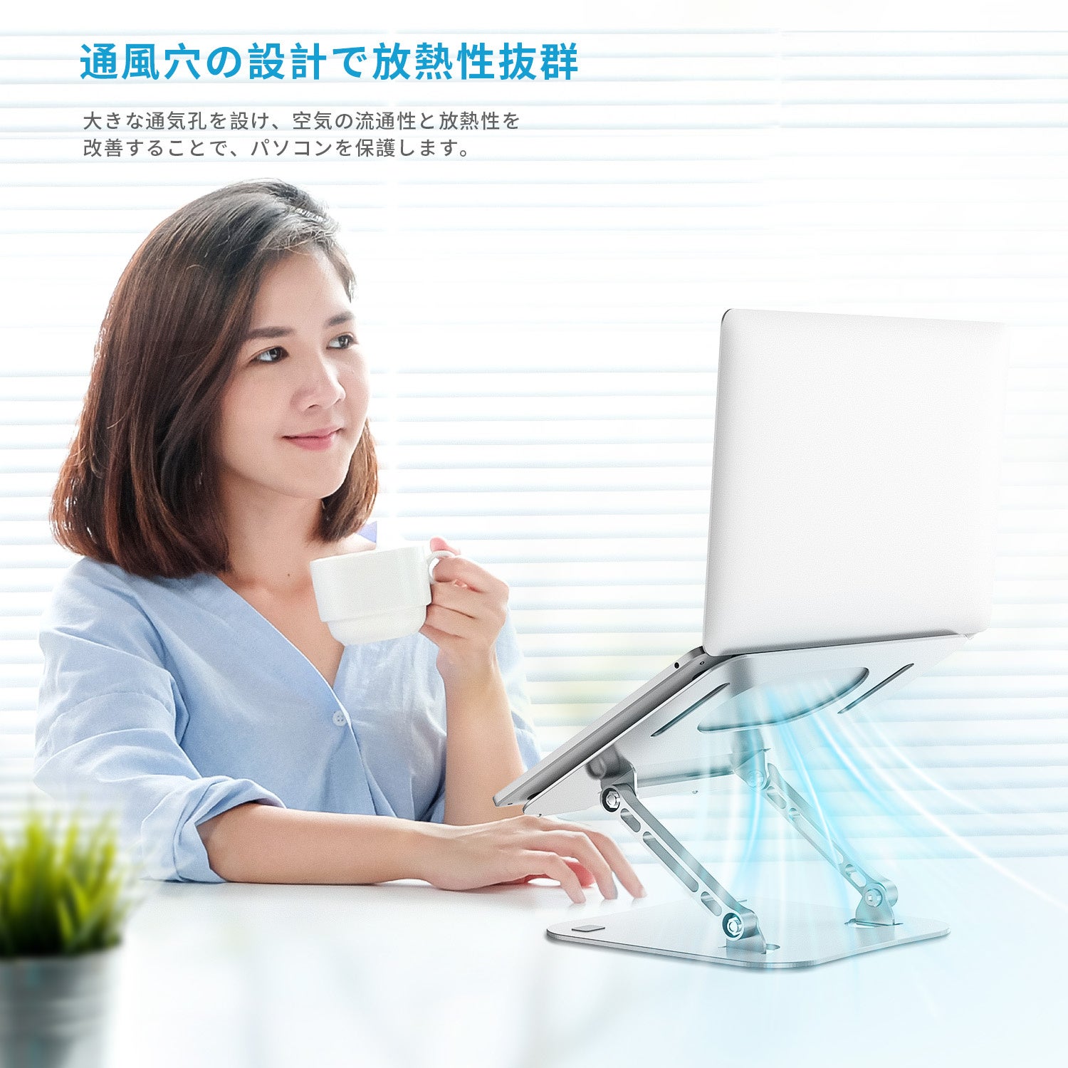 ノートパソコンスタンドは、目の疲れ、首のこり、腰痛を軽減し、快適な作業環境を提供します。調整可能な角度でノートパソコンを持ち上げ、最適な視聴角度を実現します。高品質のアルミニウム素材と広々としたパネルで、11-16インチのノートパソコンやタブレットをしっかりサポートします。さらに、滑り止めのゴムパッドと保護フックで安定した使用を約束します。