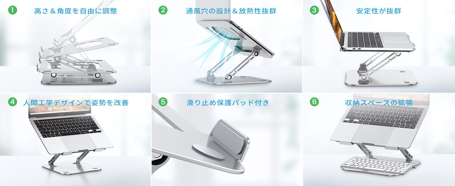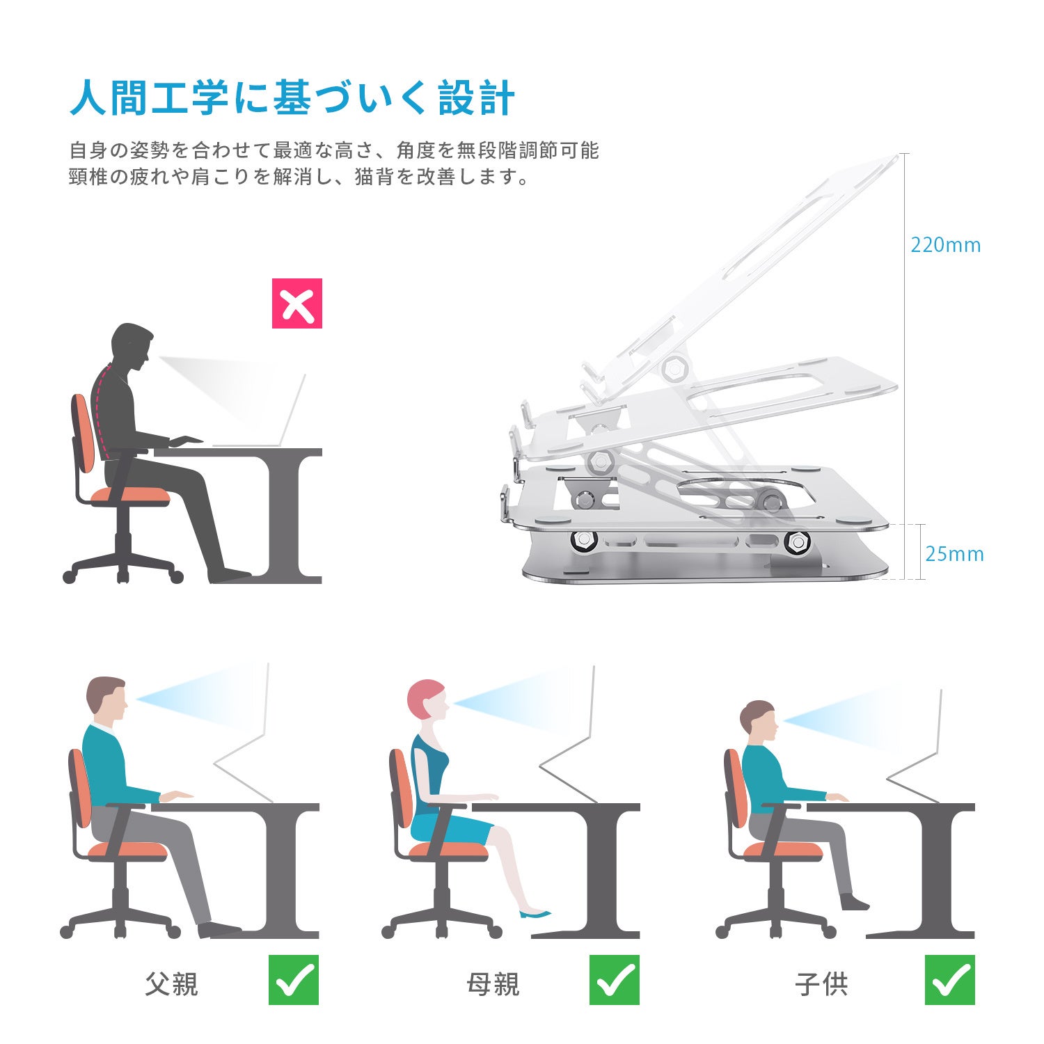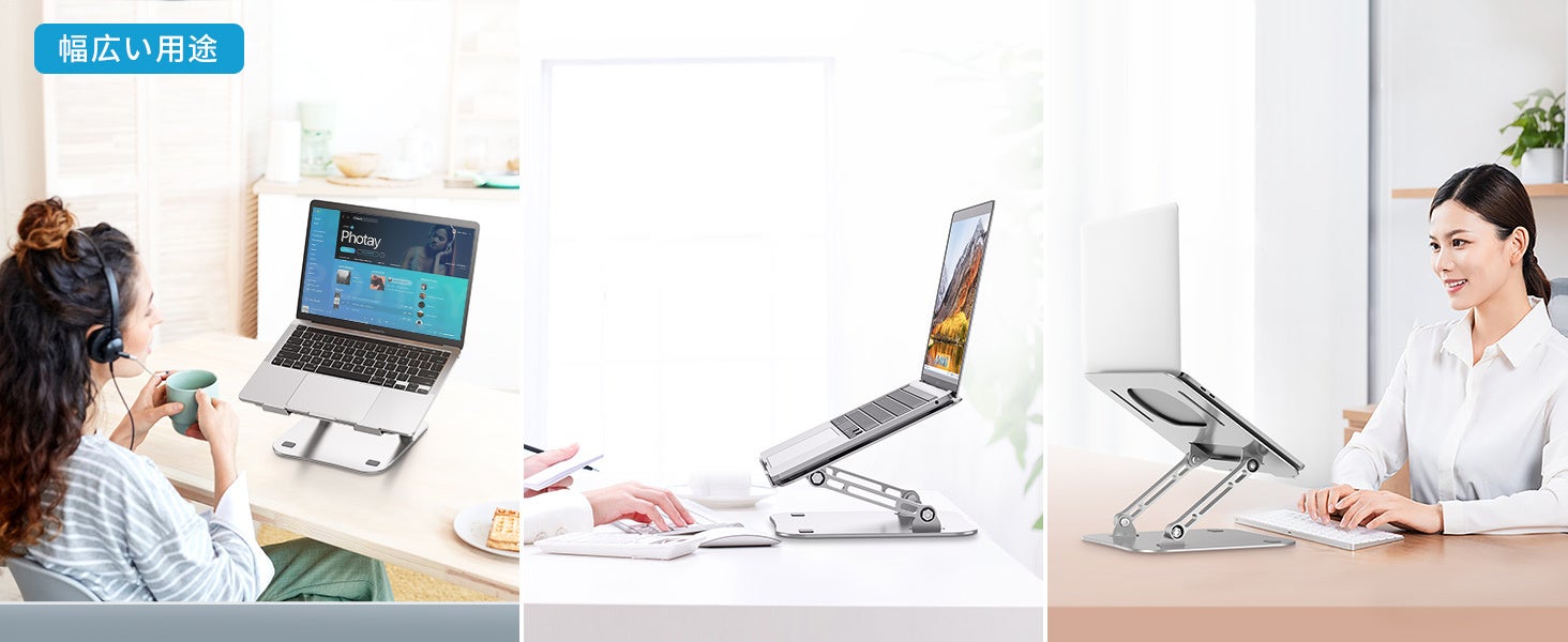 ノートパソコンスタンドは、目の疲れ、首のこり、腰痛を軽減し、快適な作業環境を提供します。調整可能な角度でノートパソコンを持ち上げ、最適な視聴角度を実現します。高品質のアルミニウム素材と広々としたパネルで、11-16インチのノートパソコンやタブレットをしっかりサポートします。さらに、滑り止めのゴムパッドと保護フックで安定した使用を約束します。