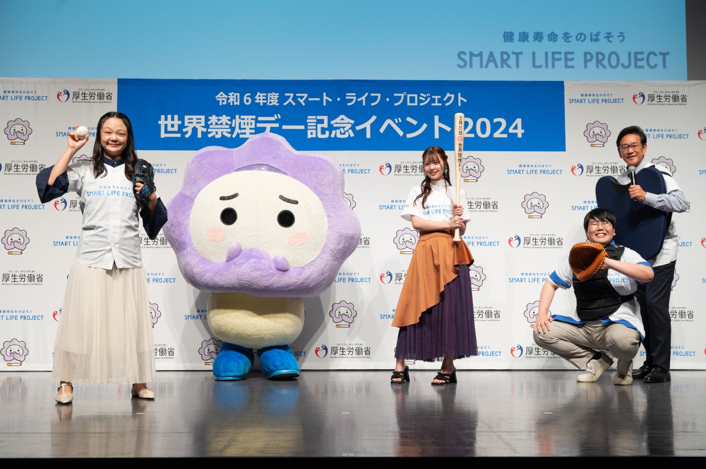 厚生労働省は、WHO(世界保健機関)が定める「世界禁煙デー」の5月31日(水)から6月6日(火)の1週間を「禁煙 週間」と定め、たばこ対策に取組んでいます。この度「世界禁煙デー」及び「禁煙週間」を迎えるにあたり、昨年に引 き続き、“スマート・ライフ・プロジェクト オフィシャルアンバサダー”に就任した、WBC(ワールドベースボールクラシッ ク)2023 日本代表監督の栗山英樹さんとゲストサポーターとして、若年層から圧倒的な人気を誇る俳優/歌手の星 乃夢奈さんキングオブコント2021、2023では決勝に進出するなど賞レースでも好成績を残しているお笑い芸人の蛙 亭のお二人にご登壇いただき、禁煙及び受動喫煙防止の普及啓発を目的とした「世界禁煙デー記念イベント」を開 催しました。 本イベントは、国民の生活習慣を改善し健康寿命を延ばすために、2011年より実施しているプロジェクト「スマー ト・ライフ・プロジェクト」の取組の一環として開催いたしました。