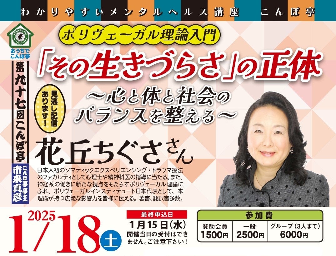 【NPO法⼈地域精神保健福祉機構・コンボ主催】第97回こんぼ亭月例会『ポリヴェーガル理論入門:「その生きづらさ」の正体~心と体と社会のバランスを整える~』(2025/01/18; オンライン開催)