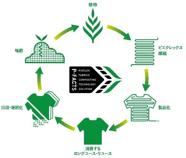 「P-FACTS」(PIECLEX FAbrics Composting Technology Solution)は、ピエクレックス社が主導し、植物由来のポリ乳酸を原料とした素材である「電気の繊維」ピエクレックスを使用したアパレル製品や繊維製品を回収し、林業や農業での利活用を目的とする堆肥化までを、パートナー企業、自治体、福祉施設、学校法人等、多くのステークホルダーと連携・共創し構築した、透明性高い循環インフラです。