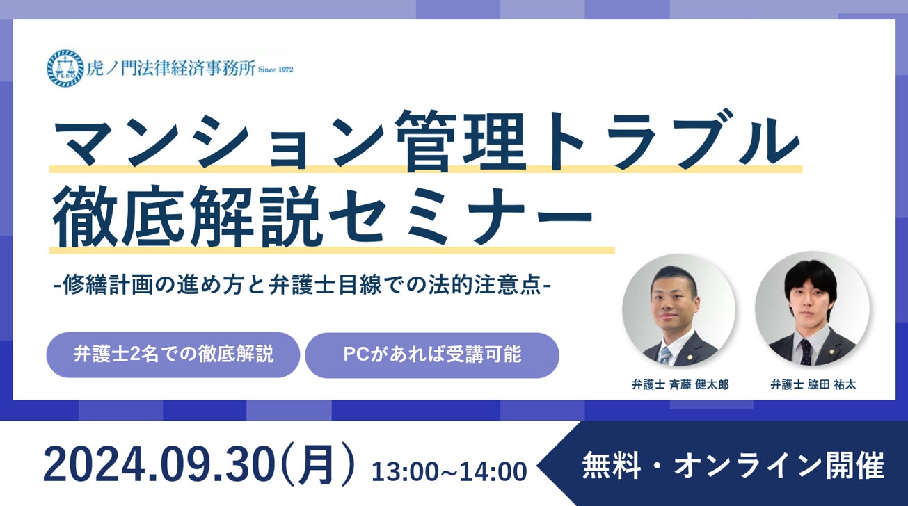 「『マンション管理でのトラブル事例-修繕計画の進め方と弁護士目線での法的注意点-』徹底解説セミナー」を無料・オンラインにて開催いたします。