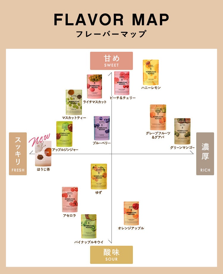 バンビウォータースタッフが作成したフレーバーマップを用意しています。全13種類の『BAMBI WATER コンブチャ酵素』の中から自分好みのフレーバー選びの参考にご利用ください。
