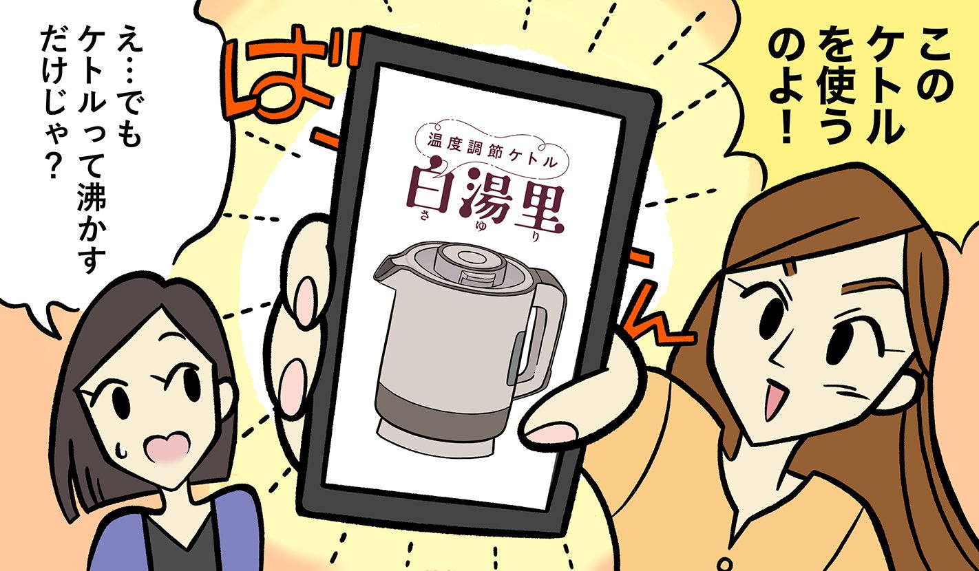 ■目覚めてすぐ白湯が飲める電気ケトル「白湯里」の凄さをマンガで解説! What’s「白湯生活」