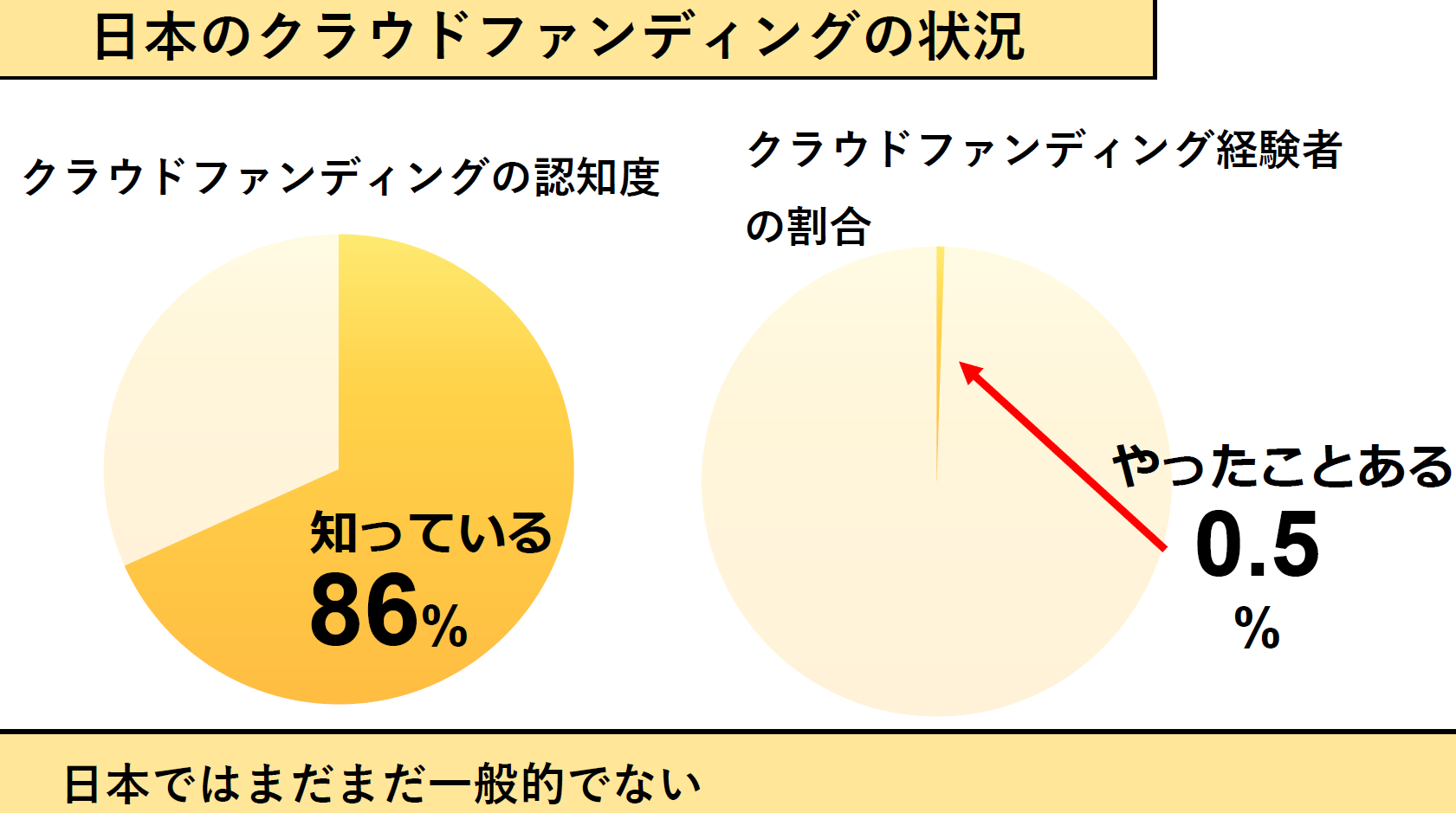 クラウドファンディングを知っている人86%。クラウドファンディング経験者0.5%。アメリカでは融資の判断基準にも。「知らない」を解決し挑戦したい方と出会うためのチームを作り、経済を回します。
