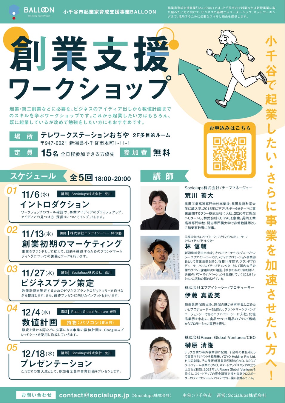 Socialups株式会社(本社:新潟県新潟市中央区、代表取締役社長:髙瀬 章充)は、新潟県小千谷市より委託を受け、小千谷市で起業、第二創業、新規事業立上げを目指す、または興味のある方々を対象に、創業支援ワークショップを開催いたします。
