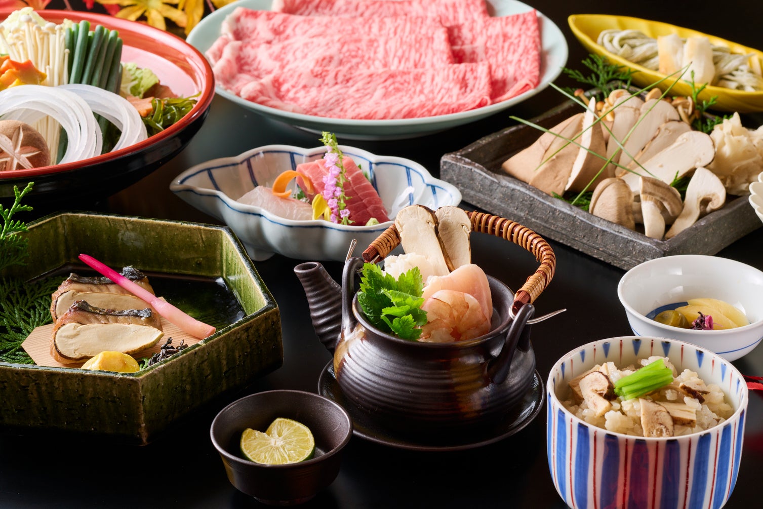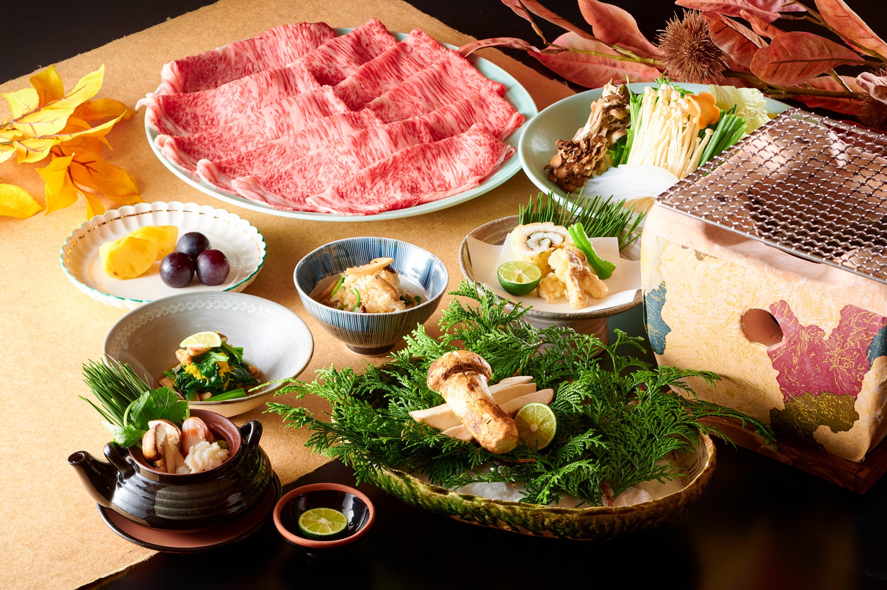 現在、提供中の季節限定「松茸コース」では、秋の香り高い松茸を、土瓶蒸しや天ぷらなど多彩なお料理でご堪能いただけます。しゃぶしゃぶ・すき焼きとともに、松茸の豊かな風味をご賞味ください。各店舗で異なる季節コースを提供していますので、商品内容につきましては各店舗にお問合せください。