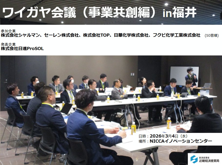 近畿経済産業局は、2026年3月4日(水)、日華化学株式会社の研究センターNICCAイノベーションセンター(注1)で、事業共創・オープンイノベーションをテーマに、福井県内の中堅・中核企業の皆様とワイガヤ会議(注2)を開催しました。