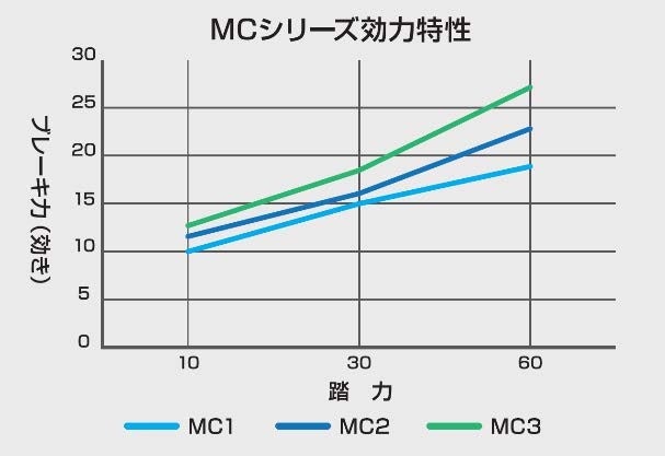 MCシリーズはスチール繊維の配合量が約30%以下のロースチール材を使用し、ミニサーキット走行に適した材質設計を行っています。走行条件に合わせたリースコントロール性に優れ、ハイグリップラジアルタイヤとの相性も考慮。低温域でも適切に使用でき、多少の鳴きやダストを許容すれば街乗りにも適しています。