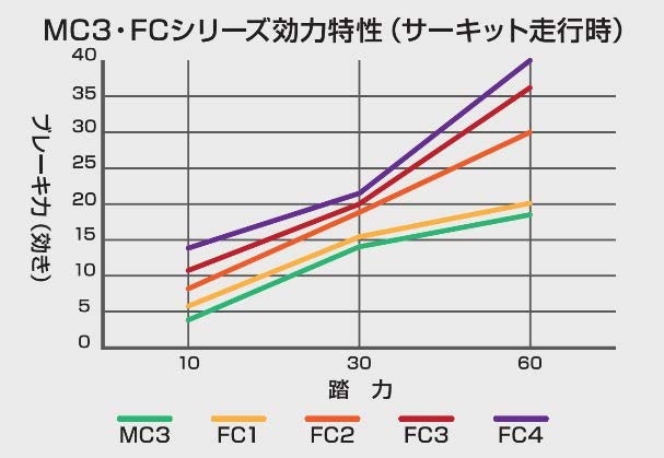 FCシリーズはスチール繊維の配合量が約30%を超え、フルサーキット走行における車速や減速度、ブレーキ液圧、ローター温度を考慮して設計されています。高温環境や連続周回に強く、耐熱性が求められるレースやタイムアタックなどに多く使用されます。また、制動力が強いマスターバック非装着車両にも適しています。