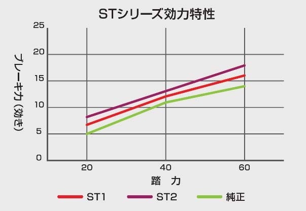 ST1は純正パッドと同等のダスト量ながら、剛性感のあるペダルタッチと、10%~15%の効力向上を実現しています。ST2は20%~30%の効力向上に加え、ワインディング走行での安定性や耐フェード性を向上。極度の鳴きや頑固な汚れを抑えたい方に適しています。