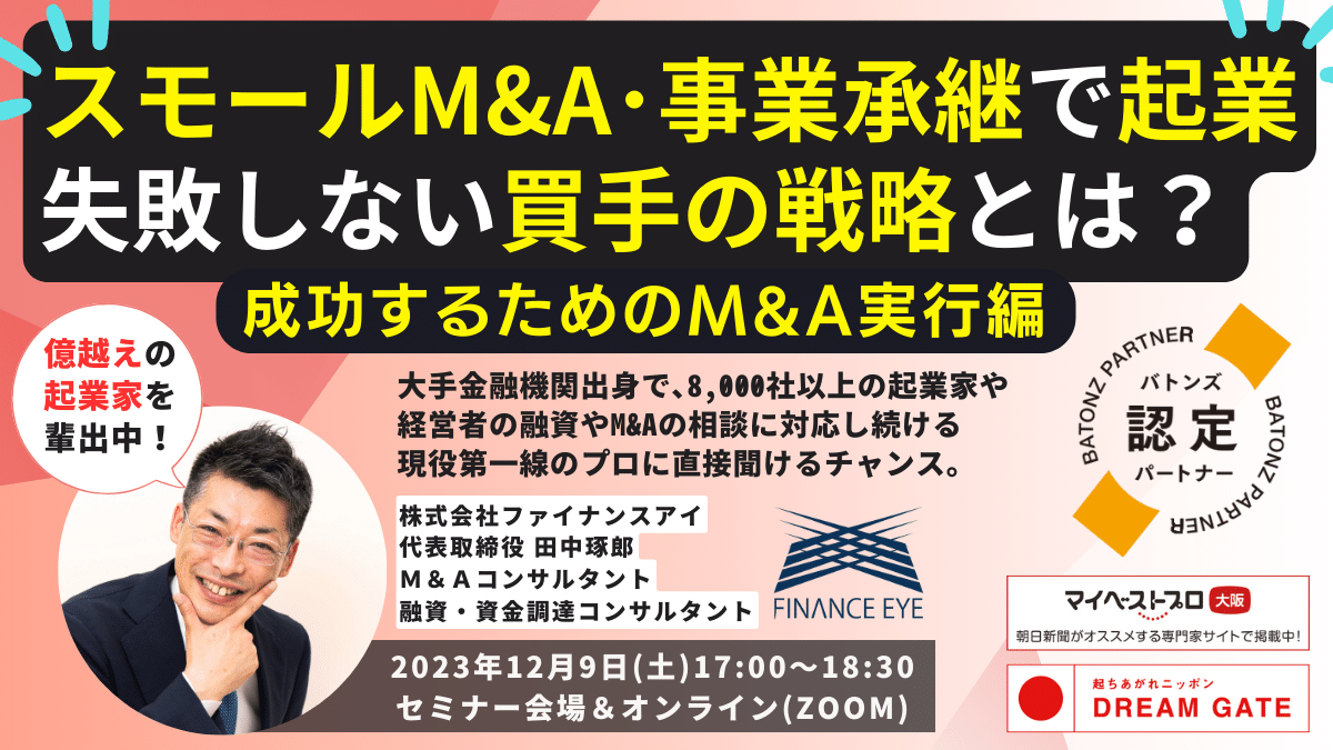 M&A実行編~個人もスモールM&Aや事業承継で起業!失敗しない買手戦略。ファイナンスアイがセミナー開催