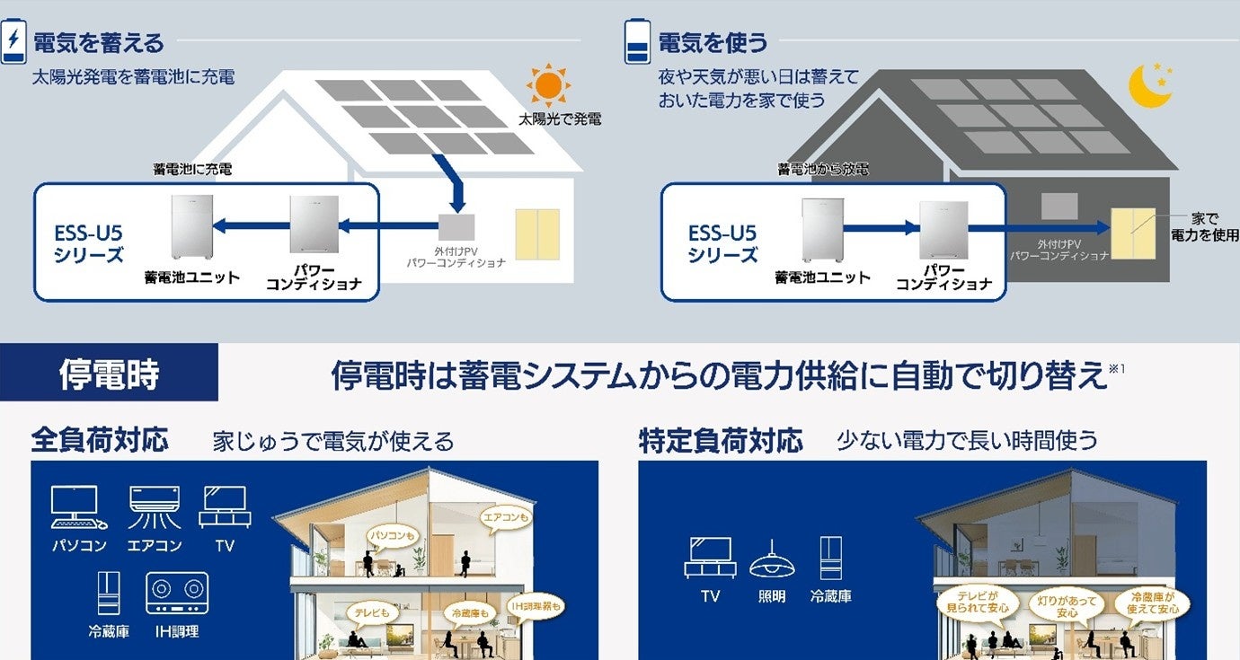単機能蓄電システム「ESS-U5シリーズ」は、ご自宅の太陽光発電システムにそのまま併設で設置可能で、いつもは「家産家消」の暮らしを目指すことができ、もしものときは、蓄電池に蓄えておいた電気を自宅で使えるシステムです。