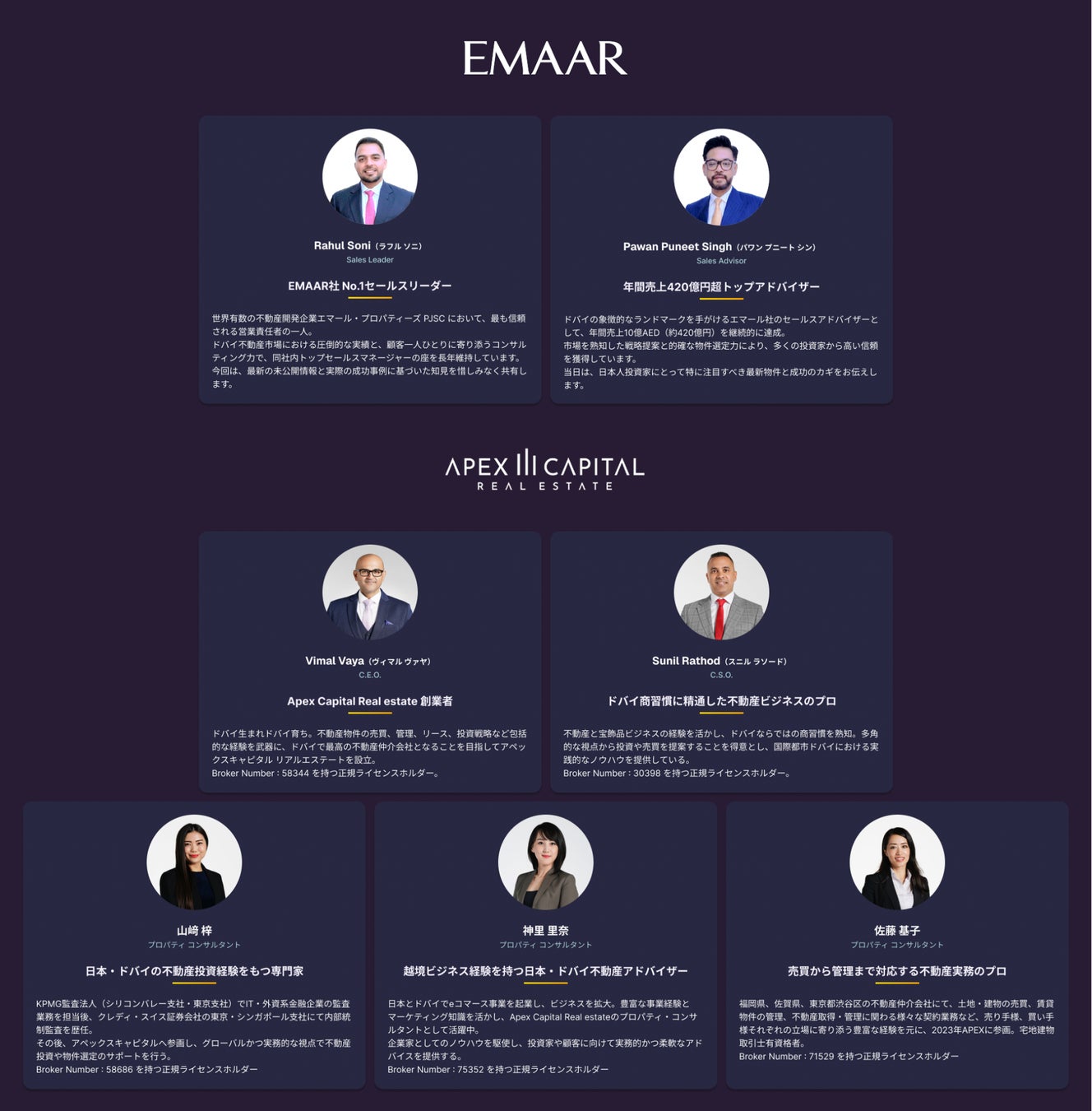 さらに、アペックスキャピタルを創業し、ドバイの商習慣に精通したヴィマル ヴァヤ氏(CEO)や、多角的なビジネス経験から“勝てる投資”を提案するスニル ラソード氏(CSO)が、現地ならではのノウハウをお届け。日本語対応のプロパティコンサルタントである山﨑 梓氏や神里 里奈氏、佐藤 基子氏も加わり、ローン、税制、物件選定などあらゆる面でのサポートを強化します。