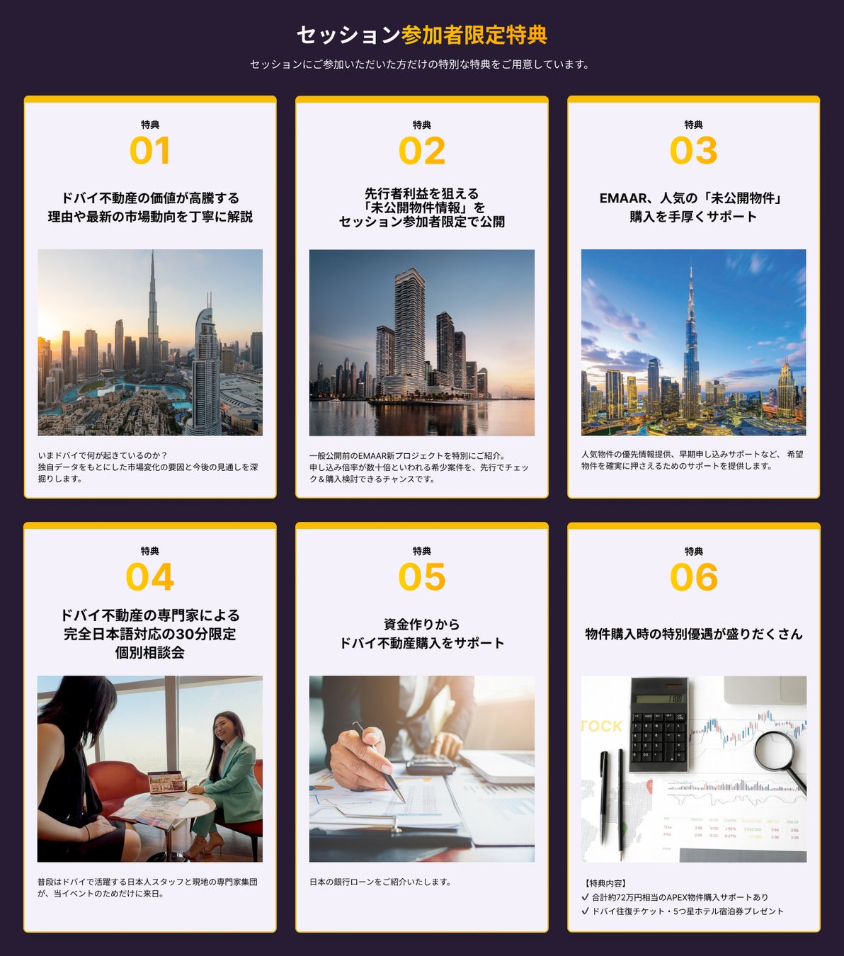 このたび、ドバイ不動産投資プレミアムセッションにご参加いただいた方限定で、以下の特典をご用意いたしました。価格が高騰し注目を集めるドバイ不動産の最新情報を得るだけでなく、未公開物件への先行アクセスや専門家によるサポートを受けられる絶好の機会です。