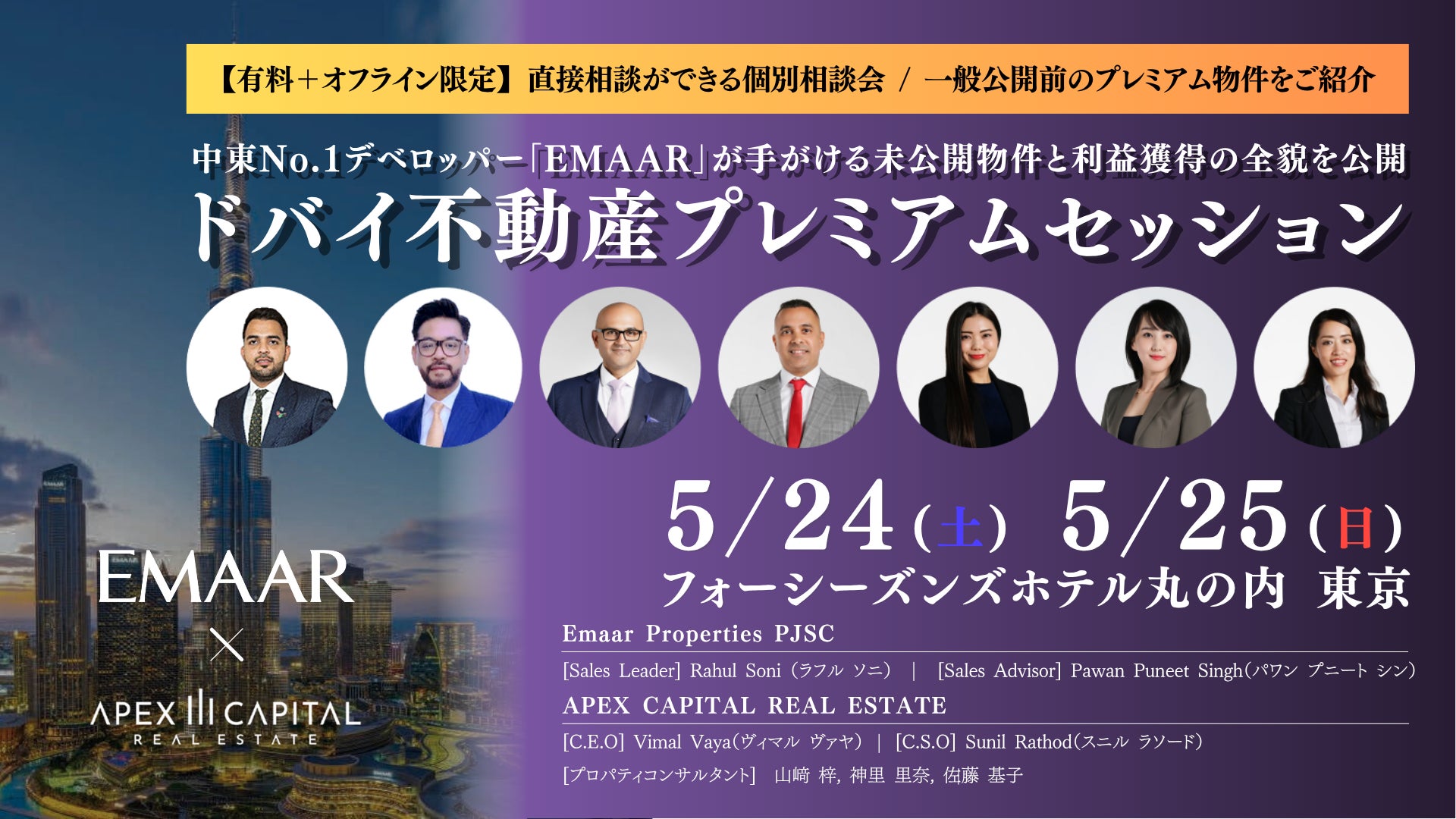 ドバイNo.1の不動産デベロッパー*であるEMAAR(エマール)を再び招き、約17年の業界経験を誇るアペックスキャピタルが、有料プレミアムセッションをフォーシーズンズホテル丸の内 東京にて、2025年5月24日(土)、25日(日)の2日間限定で開催いたします。