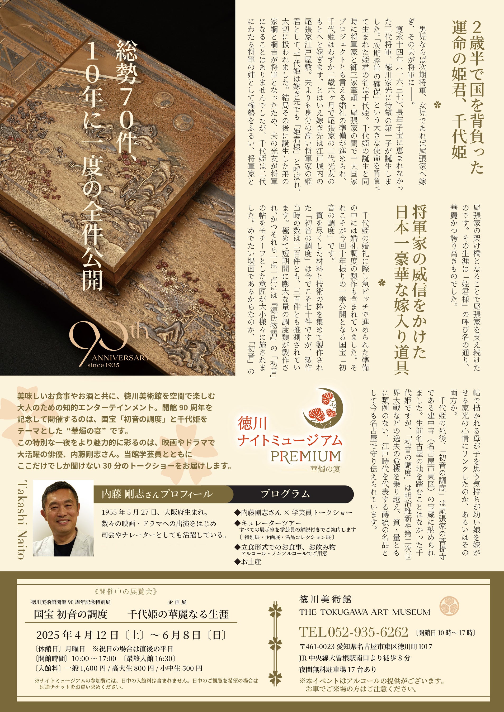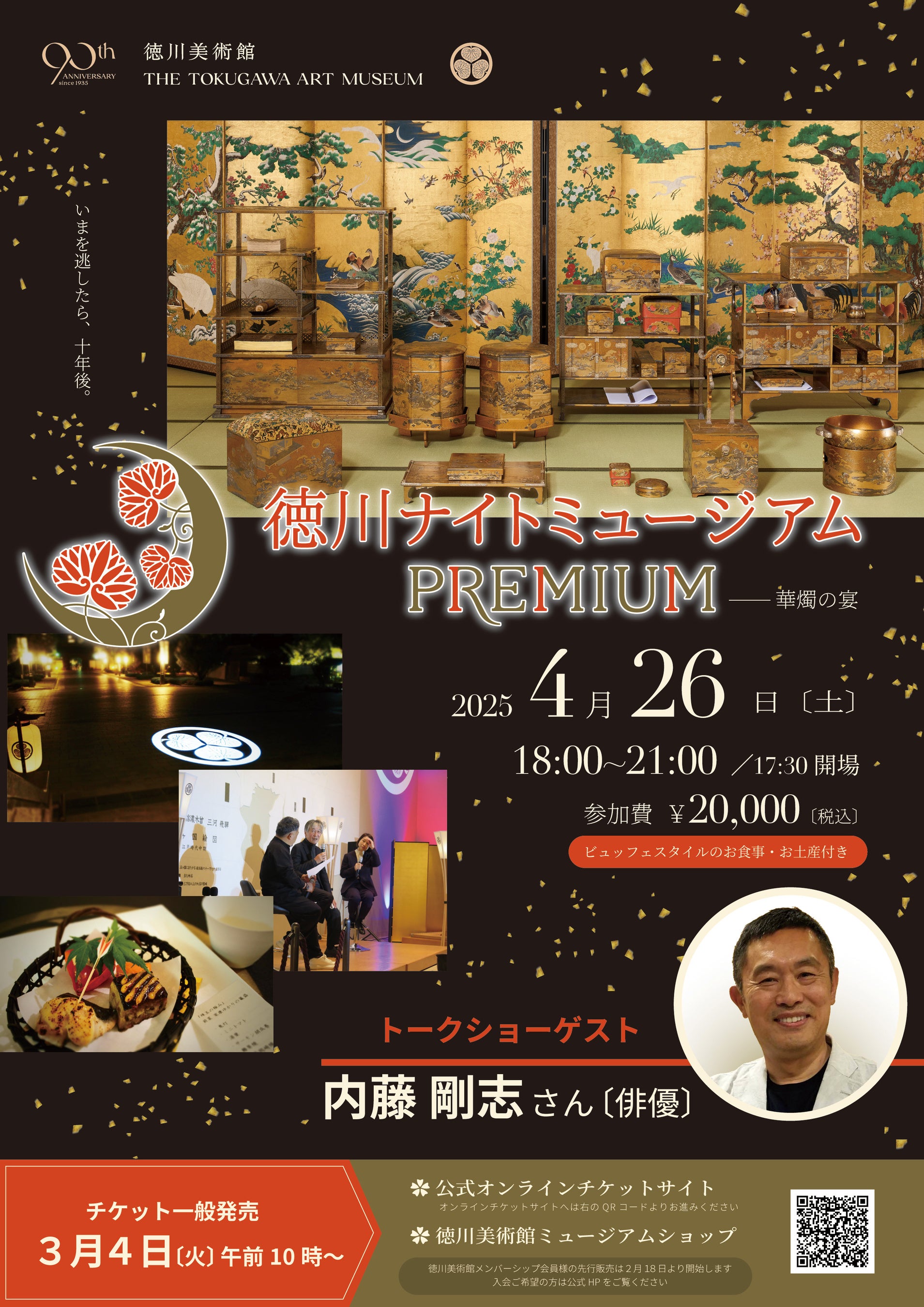 徳川美術館(名古屋市東区徳川町1017/館長 徳川義崇)は、「徳川ナイトミュージアムPREMIUM 華燭の宴」を4月26日(土)に開催いたします。このイベントは、10年ぶりに開催される国宝「初音の調度」の全点一挙公開を記念するもので、俳優の内藤剛志さんをゲストに迎えたトークショーや展覧会のキュレーターツアーなど、大人の感性を磨く特別な夜をお届けします。ぜひこの贅沢な時間をお楽しみください。