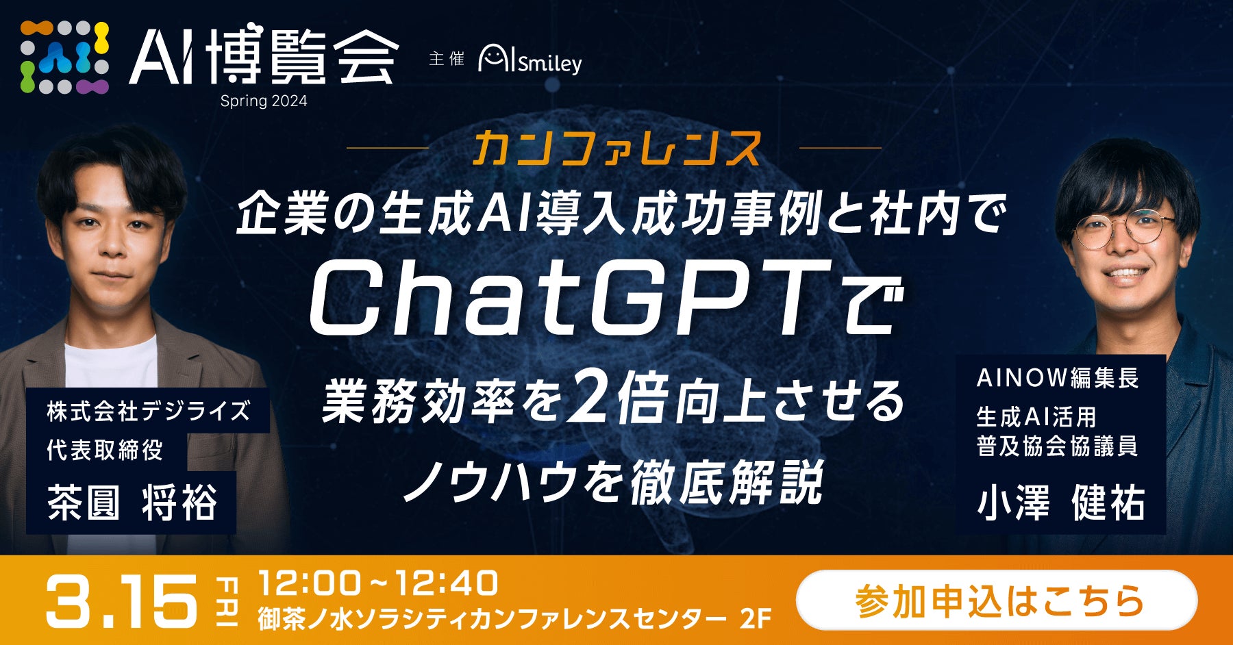 株式会社デジライズ(東京都渋谷区、代表取締役:茶圓将裕、以下デジライズ)は、2024年3月14日(木)〜3月15日(金)に開催される「AI博覧会 Spring 2024」に出展いたします。また開催2日目には、AI情報を発信し、X(旧:Twitter)でフォロワー約10万人を抱えるAIスペシャリスト 弊社代表チャエンがカンファレンスに登壇いたします。最新の生成AIトレンド予想、ChatGPTを使った実践的な業務活用法に加えて日本企業のAI導入状況についてく詳しく解説いたします。