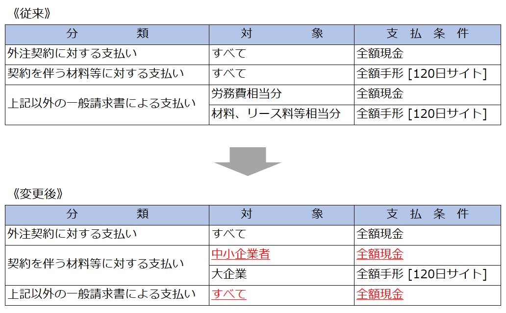当社は、2022年4月以降に締結した新規外注契約取引について、支払条件を全額「現金払い*¹」としておりますが、2024年4月1日以降に契約する材料等に対するお支払の内、中小企業者*²様を対象に全額「現金払い」へ変更いたします。また、上述以外の契約を伴わない請求書によるすべてのお支払いにつきましても、4月締めのご請求より全額「現金払い」へ変更いたします*³。