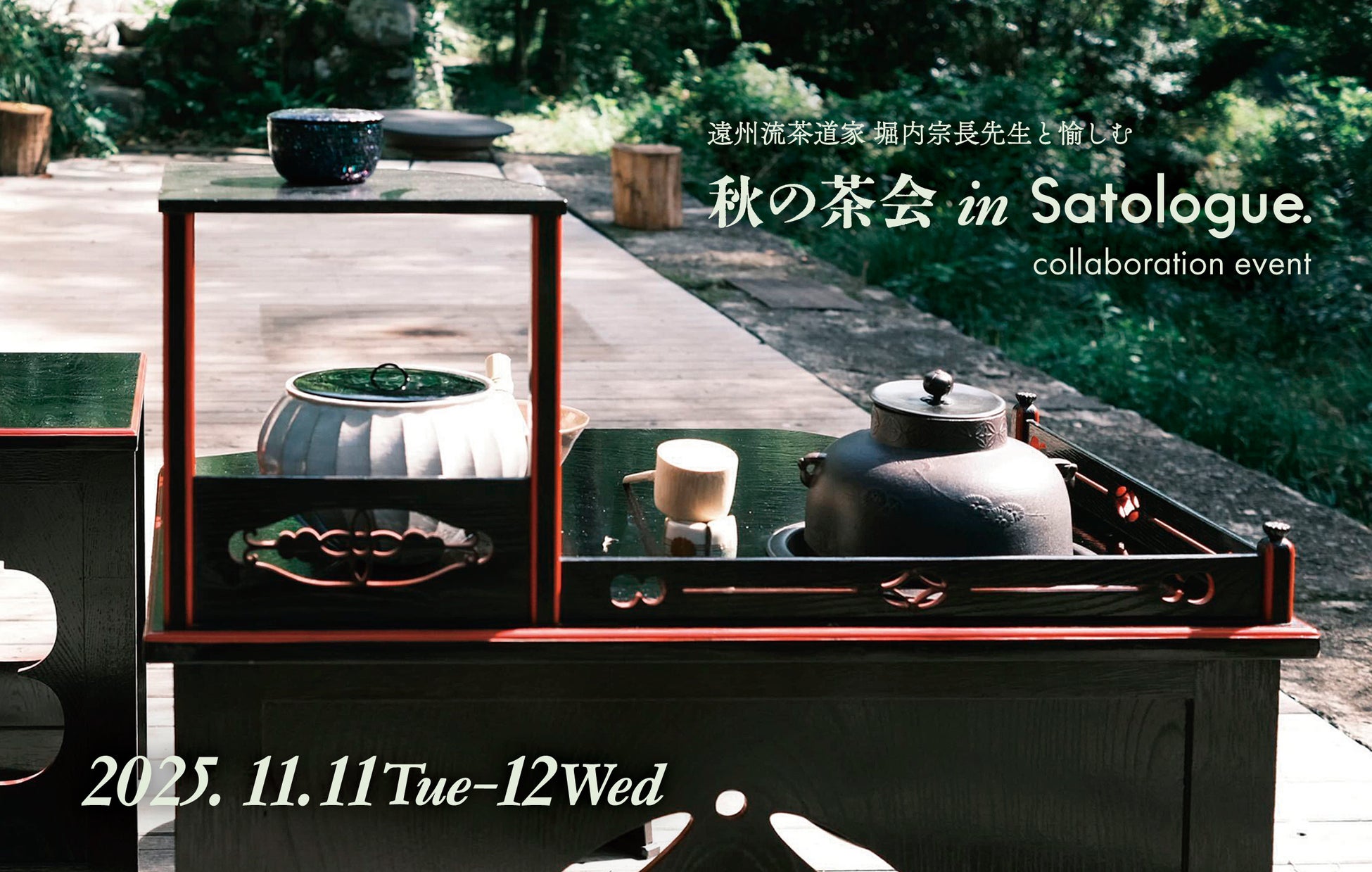 秋の自然に囲まれた「Satologue」の敷地内で、茶道家・堀内宗長氏による本格的な茶会を開催します。