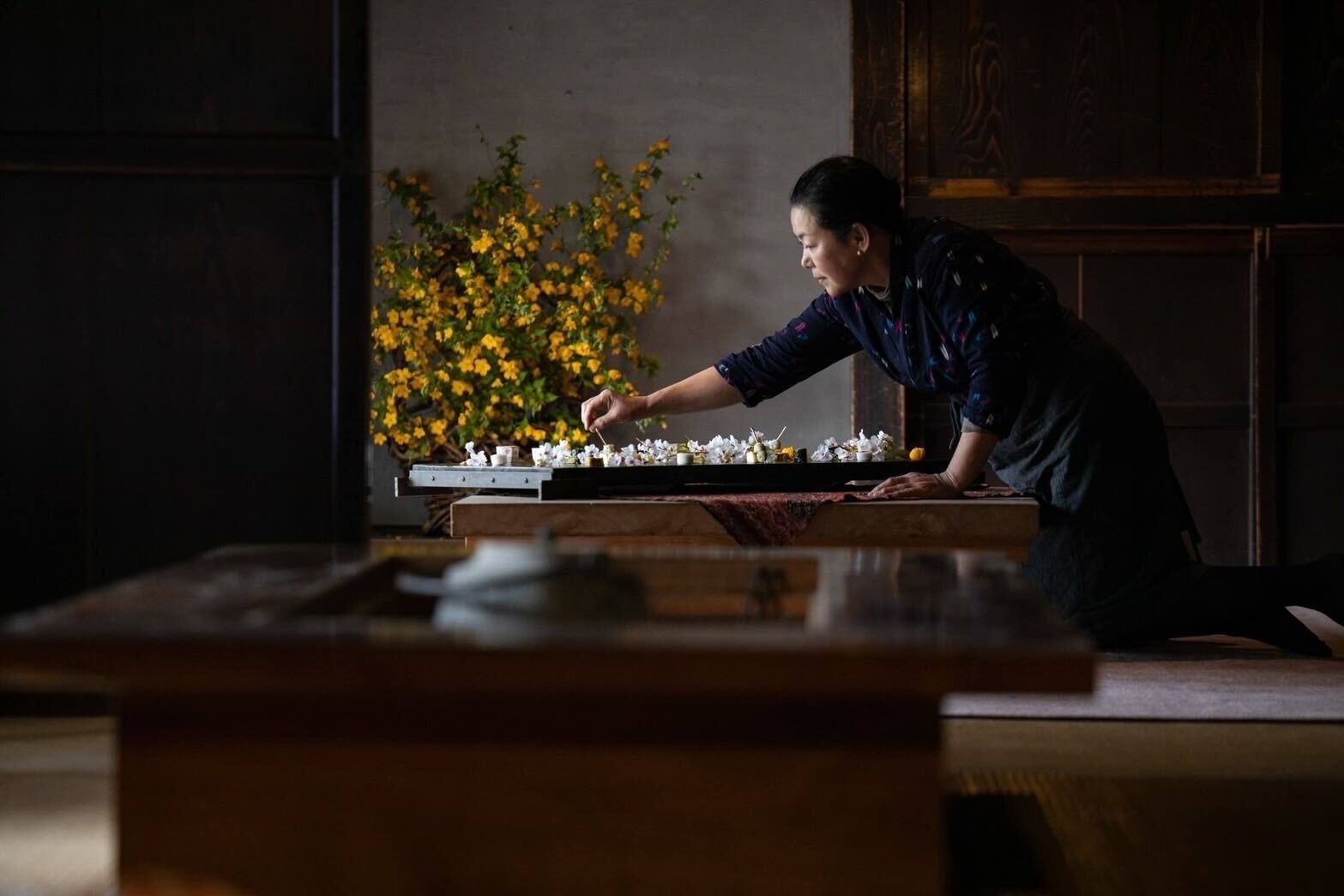 築200年以上の古民家の空間と共にお料理を楽しむ、1日1組限定のレストラン。陶芸家 故 加藤千博氏の料理を引き立てる器で、妻でシェフである加藤敦子氏が腕を振るっています。