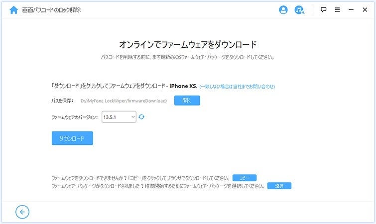 Step 3.デバイスを接続した後、利用可能なファームウェアが自動的に検出されますので、バージョン確認して「ダウンロード」をクリックします。
