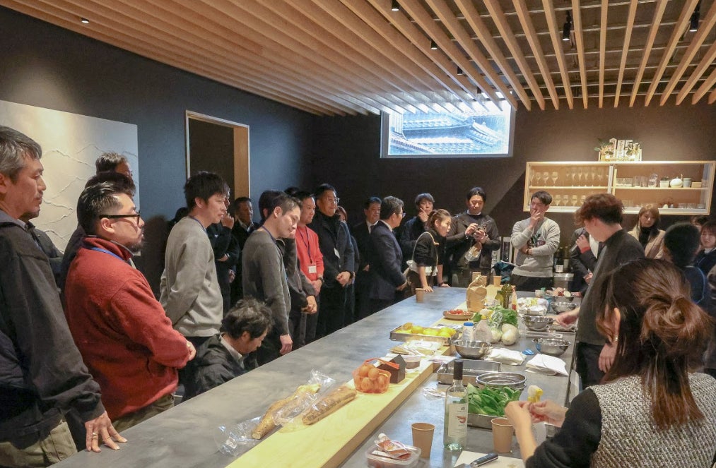 午前中はおおい町の「長井しいたけ組合」にて、水分量83%の革新的な菌床しいたけ“マイクロフンギ”を視察。生食も可能な驚異的な品質に参加シェフから高い関心が寄せられました。続いて「企業組合うめっぽ」にて紅映梅の加工品を見学。昼食は料理旅館「由幸」にて若狭まはたを試食し、養殖現場も視察しました。午後は高浜町に移動し、「青葉山ハーバルビレッジ」にて約500種の有用植物が自生する薬草文化を体験。夕方には高浜町の「fuu resort」にて、参加シェフ全員による即席クッキングセッション&交流会を開催。高浜町長・副町長も参加し、嶺南食材を使った創作料理を通じて食材の可能性を議論しました。