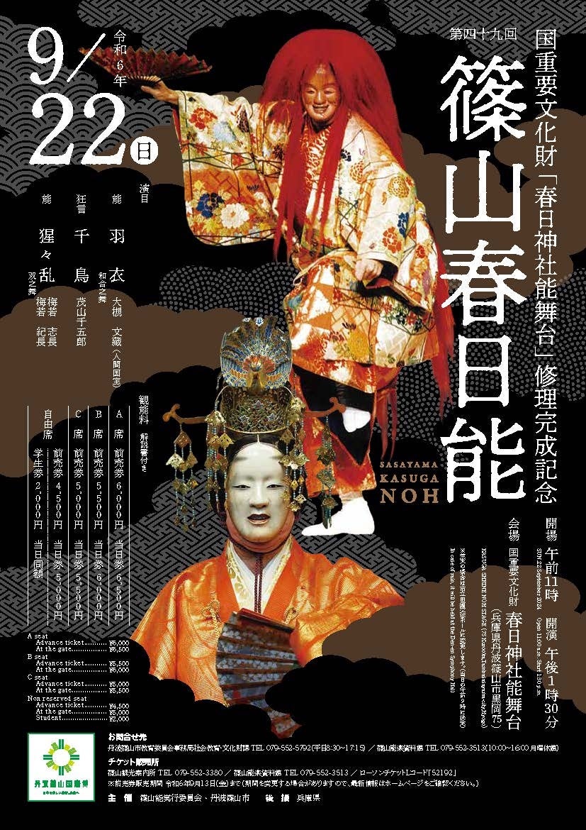 修理工事のため延期となっていた篠山春日能が9月22日(日)に開催されます。「春日神社能舞台」は正統的な格式に加え,床下に音響のための大甕を備えており、西日本でも屈指の能舞台として、高い価値があります。国重要文化財に指定されている能舞台で篠山春日能の魅力をご堪能下さい。