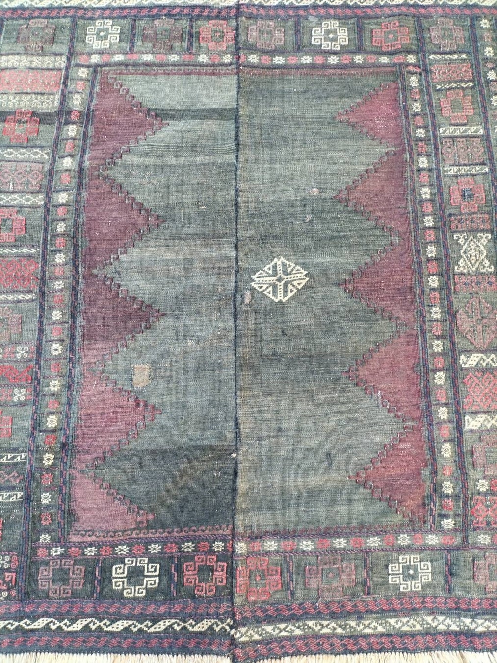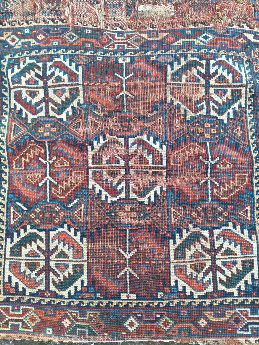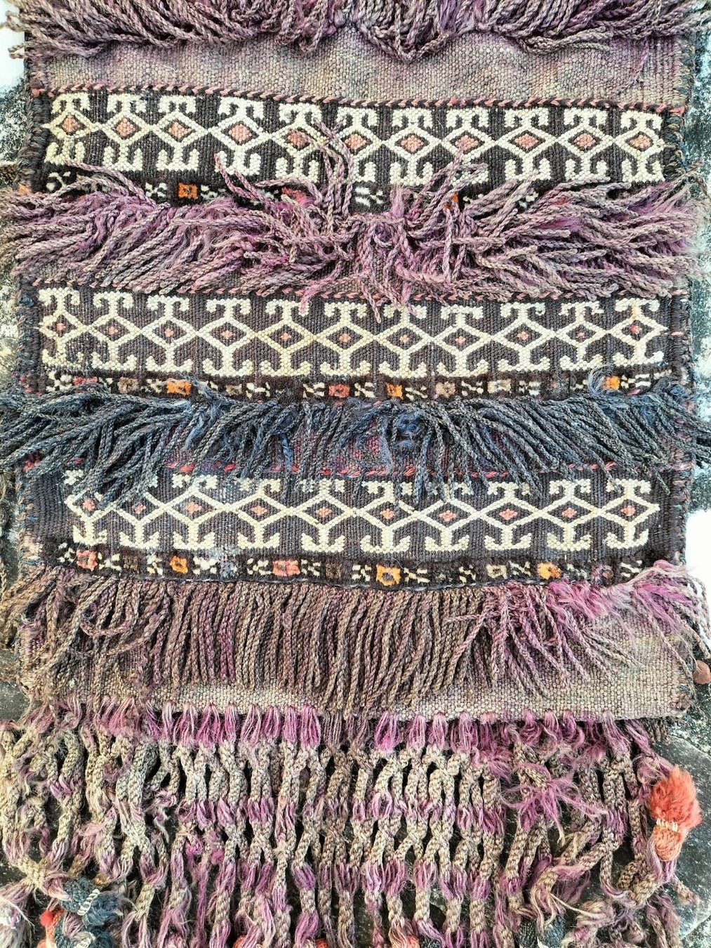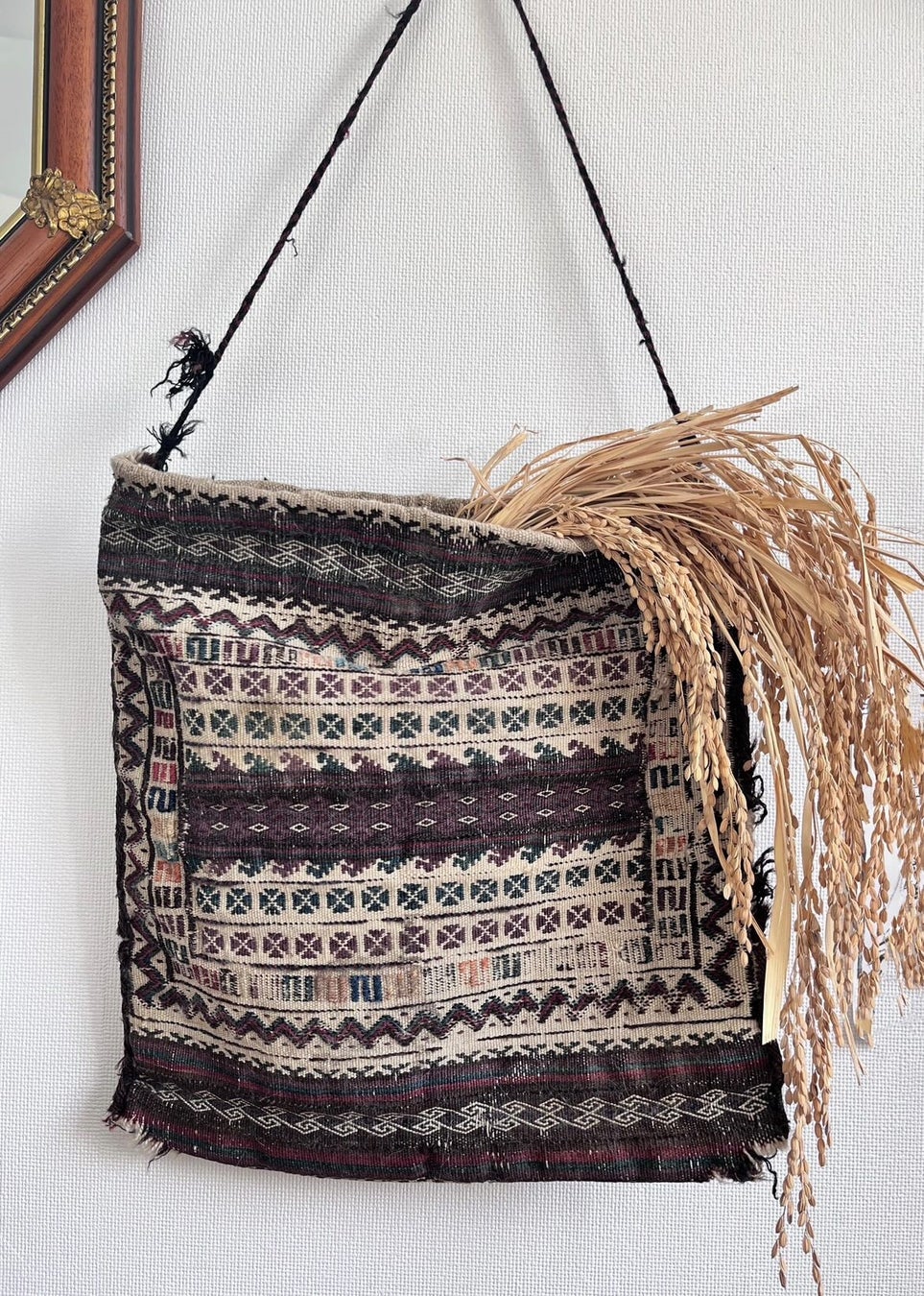 遊牧民は元来移動してのテント生活のため、かさばる家具などは一切持ちません。移動の際は各種の毛織物の袋に家財道具一式を入れ、家畜である馬・ラクダ・ロバ等の鞍上に乗せて運びます。家畜の背中は丸いため、固く角張った木箱や革製の袋では不適ですが、その点毛織物の袋は素直にしなって弾力性もあり、さらには羊毛ならではの吸湿発散性も優れており、鞍掛袋の素材として最適のものでした。そしてその一つ一つの毛織物の道具の中に部族の象徴といえる伝統の文様が織り込まれており、これらは部族や民族集団の権威や独自性を表しています。古来の日本においての旗や家紋のような意味合いに近いかも知れません。遊牧民の生活道具としての様々な毛織物は、過酷な自然の中で遊牧生活を営むために必要な機能を高めるための様々な創意工夫によって完成した機能美・造形美であり、正に必然性から生まれた「用の美」といえるでしょう。
