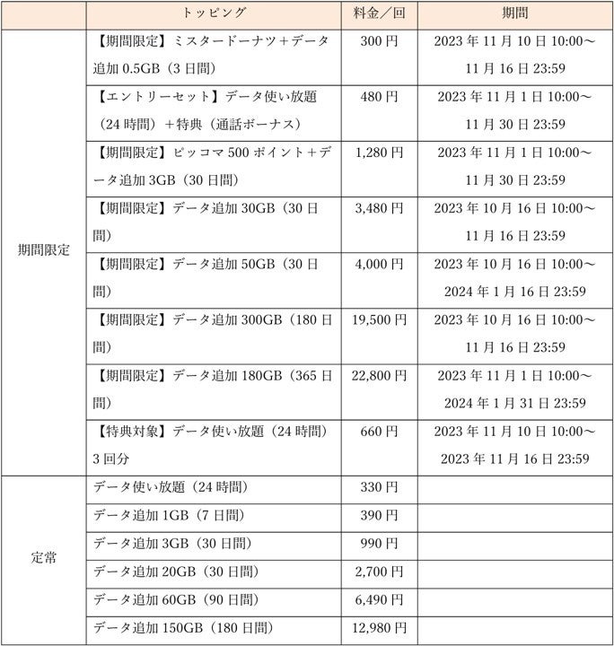 (参考)提供中のデータトッピング一覧(2023年11月16日時点)
