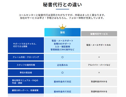 コールセンターの開設・運用に興味をお持ちの方々からは「秘書代行サービスとの違いがわからない」という疑問を寄せられることがあります。そこで、当社サービスと秘書代行サービスの特徴や内容を表にまとめることで、両者の違いが視覚的にご理解いただきやすくなりました。