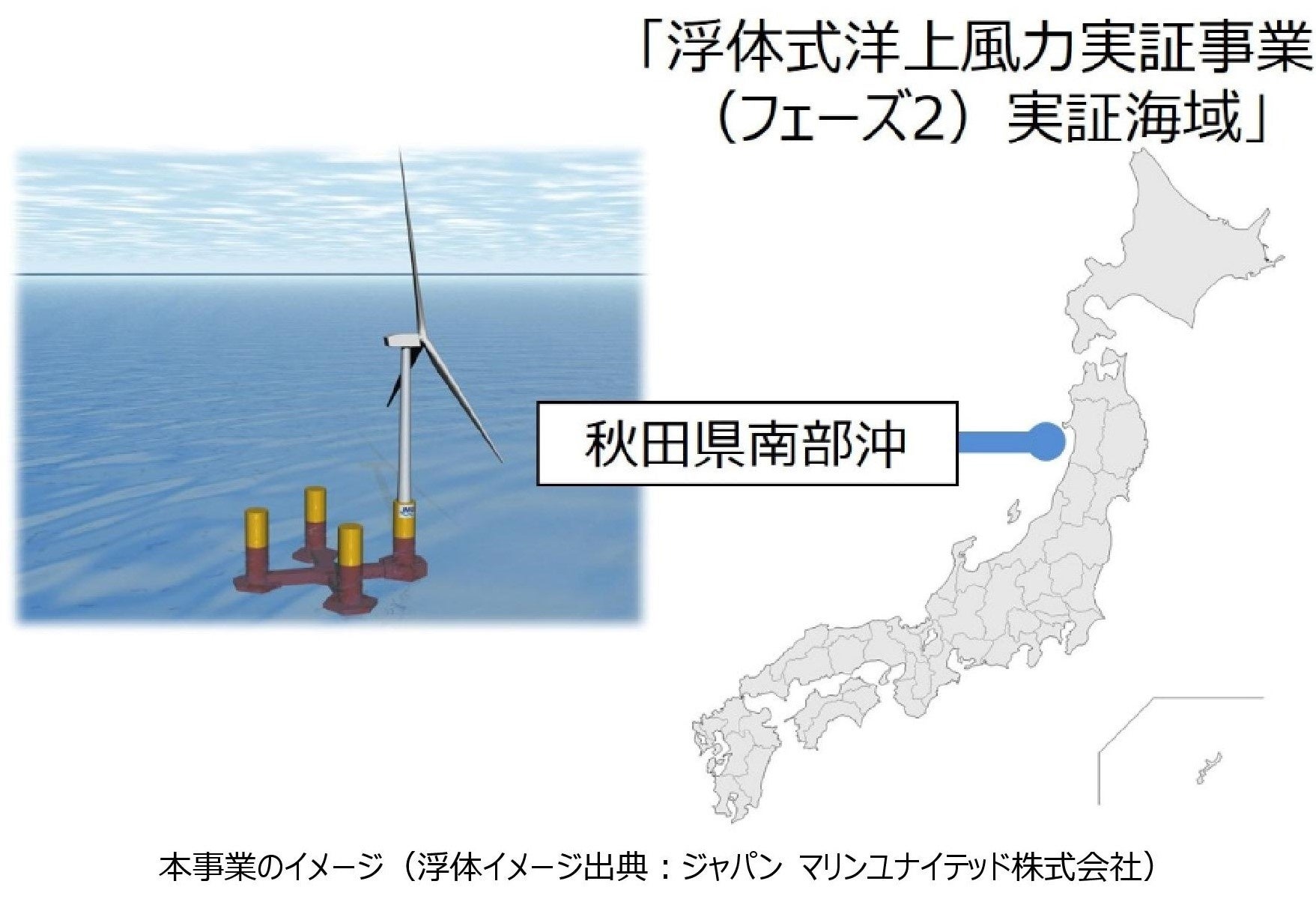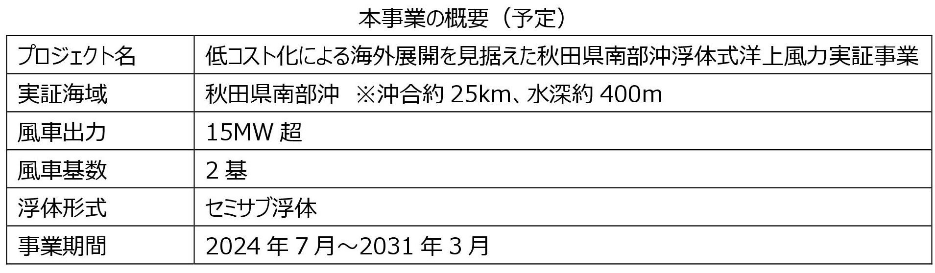 本事業は、秋田県南部沖の沖合約25km、水深約400mの海域に、1基あたり15MW超の風力発電機2基を設置し、2029年秋頃の運転開始を予定しています。なお、本事業の期間は2024年7月から2031年3月です。