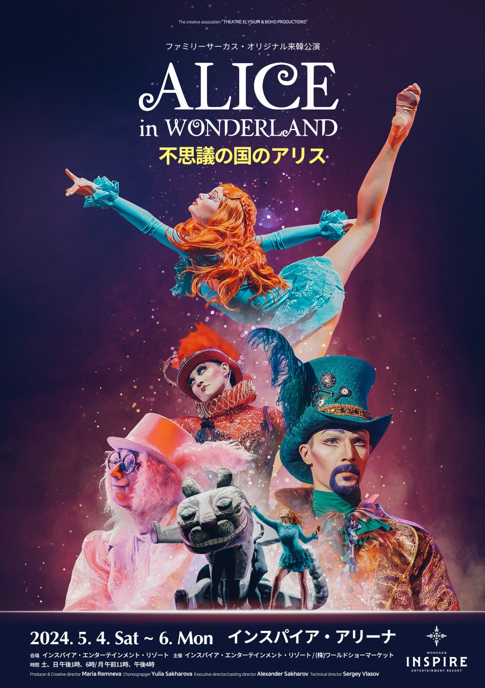 インスパイア・アリーナが主催する初のサーカス公演、ファミリーサーカスショー「不思議の国のアリス」ワールドツアーショーは、イギリス人作家ルイス・キャロルによる不朽の名作「不思議の国のアリス」を題材にしています。サーカス、モダン・バレエ、アクロバット、そしてミュージカル・シアターを融合させた個性的なパフォーマンスで、原作のファンタジーとアドベンチャーにあふれた世界を表現します。ヨーロッパのトップパフォーマーや、世界的に有名な曲芸師、そして国際的なサーカス芸術賞の受賞経験者で構成されたオリジナルキャストが贈るこのワールドツアーショーは、アリス、白うさぎ、チェシャ猫、その他物語の主要登場人物が登場し、美しいパフォーマンスと不思議なストーリーで子供も大人も魅了する90分間の公演となっています。