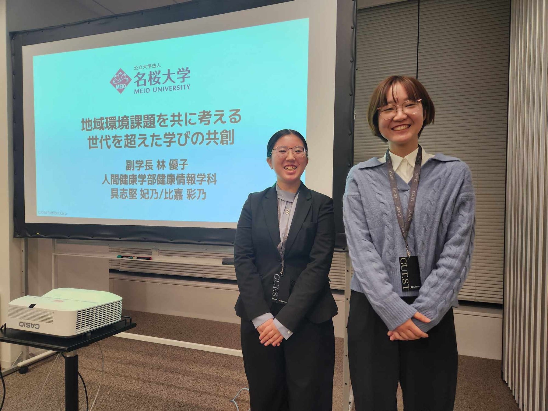 本学からは、副学長の林 優子が登壇して本学の概要を説明したうえで、人間健康学部健康情報学科2年生の具志堅 妃乃さん、比嘉 彩乃さんの2名が、ソフトバンクとの産学連携により2024年6月から11月までの期間に沖縄県恩納村で取り組んできた「うんな魂」プロジェクトについて報告を行いました。