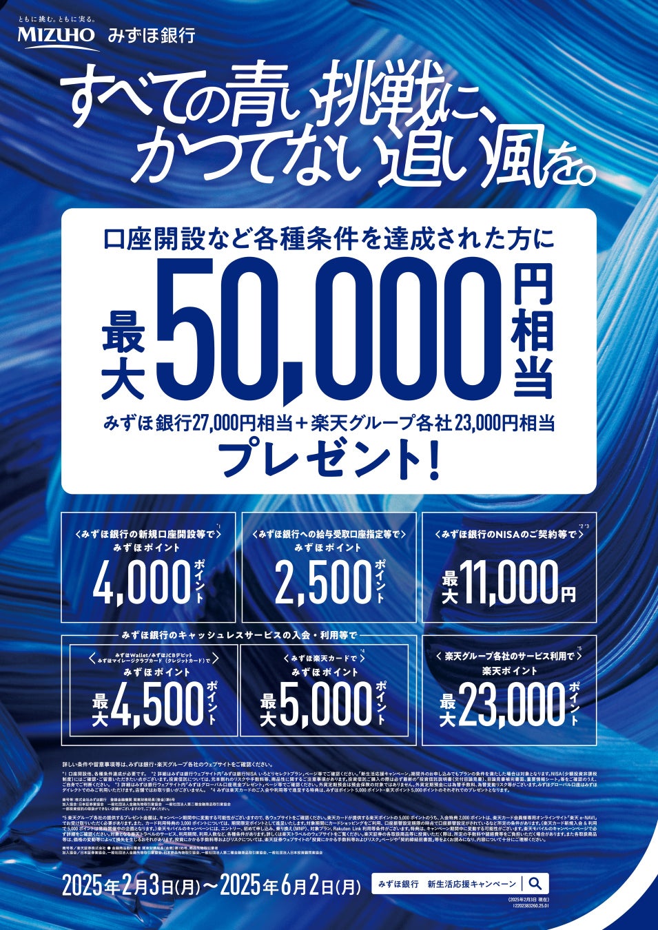 「すべての青い挑戦に、かつてない追い風を。」をテーマに、みずほ銀行史上最大級となる最大50,000円相当が貰える「新生活応援キャンペーン」を開催しております。