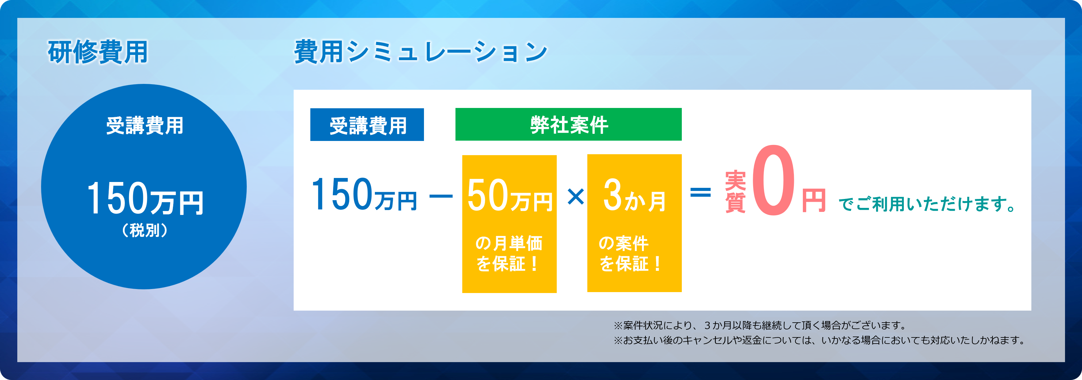 ※弊社案件参画(月額50万円相当)3ヶ月を保証いたしますので、実質無償で受講していただくことができます