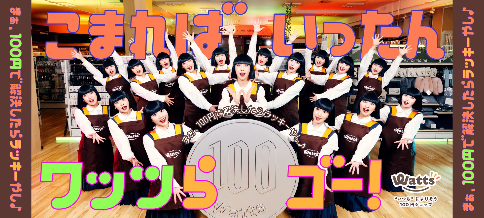 ワッツは創業30周年を契機に、「まずはワッツで“100円で解決できるかも”」というライトな来店動機を提示。TikTokやInstagramなどSNSを中心に話題沸騰中、世界中から人気を集めるダンスチーム「アバンギャルディ」とコラボし、「こまればいったんワッツらゴー!」「まぁ、100円で解決したらラッキーやし♪」というメッセージで、ワッツ初のオリジナルソングを制作。店内を舞台に100円玉をリレーしながら踊るオリジナルダンスを披露する記念ムービーを公開しました。