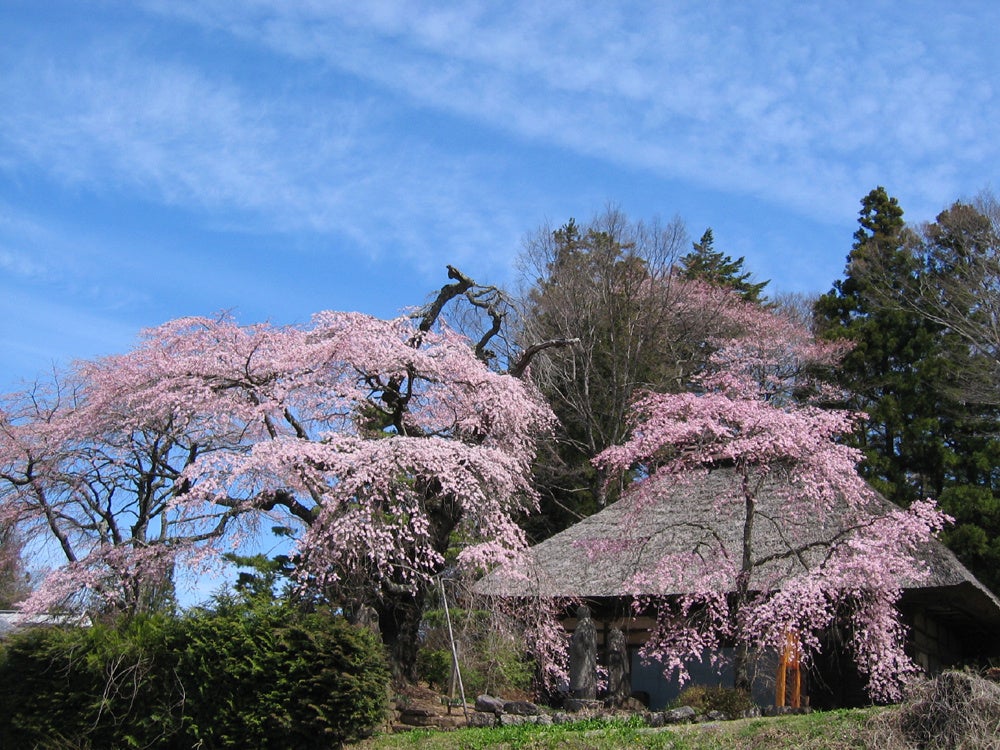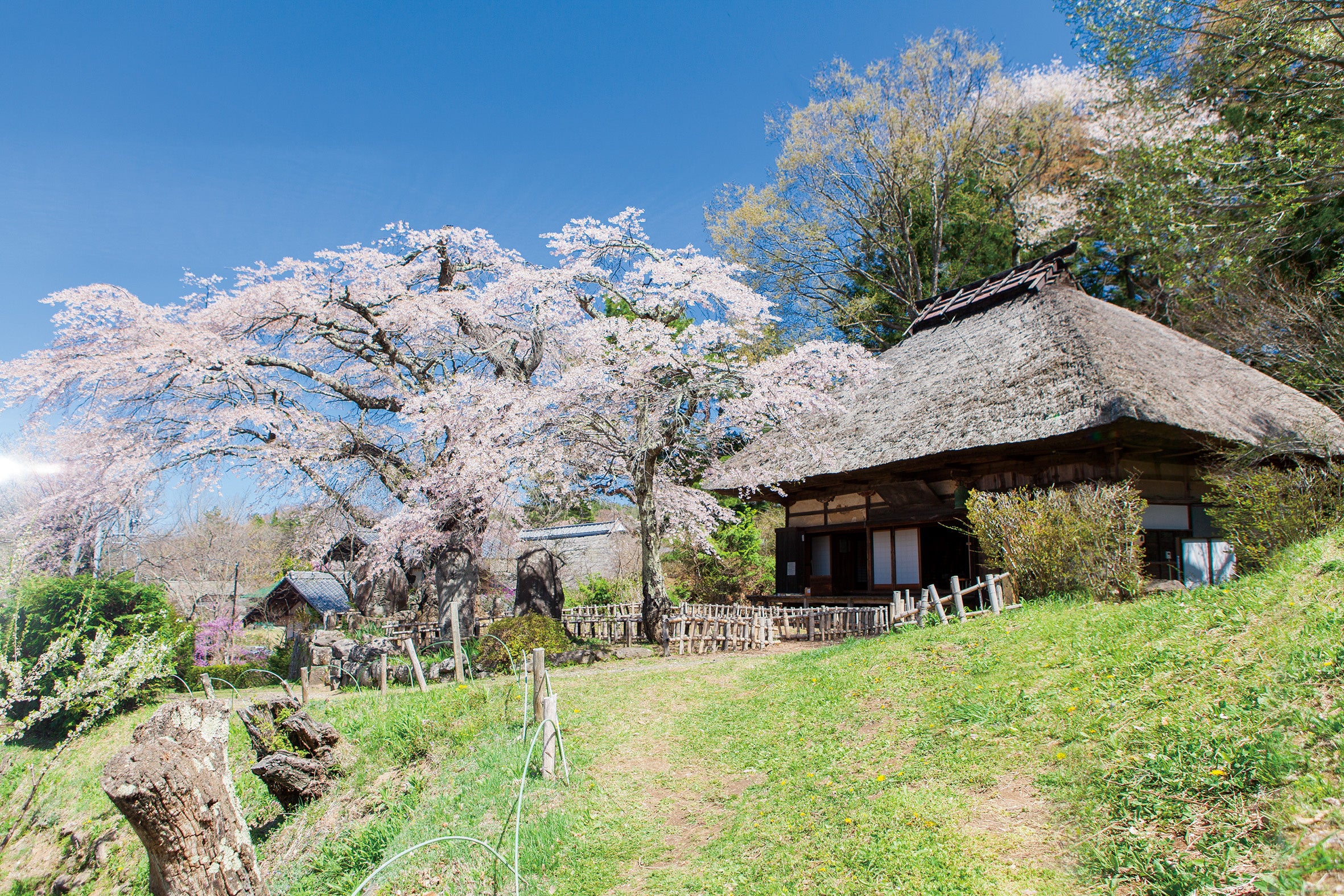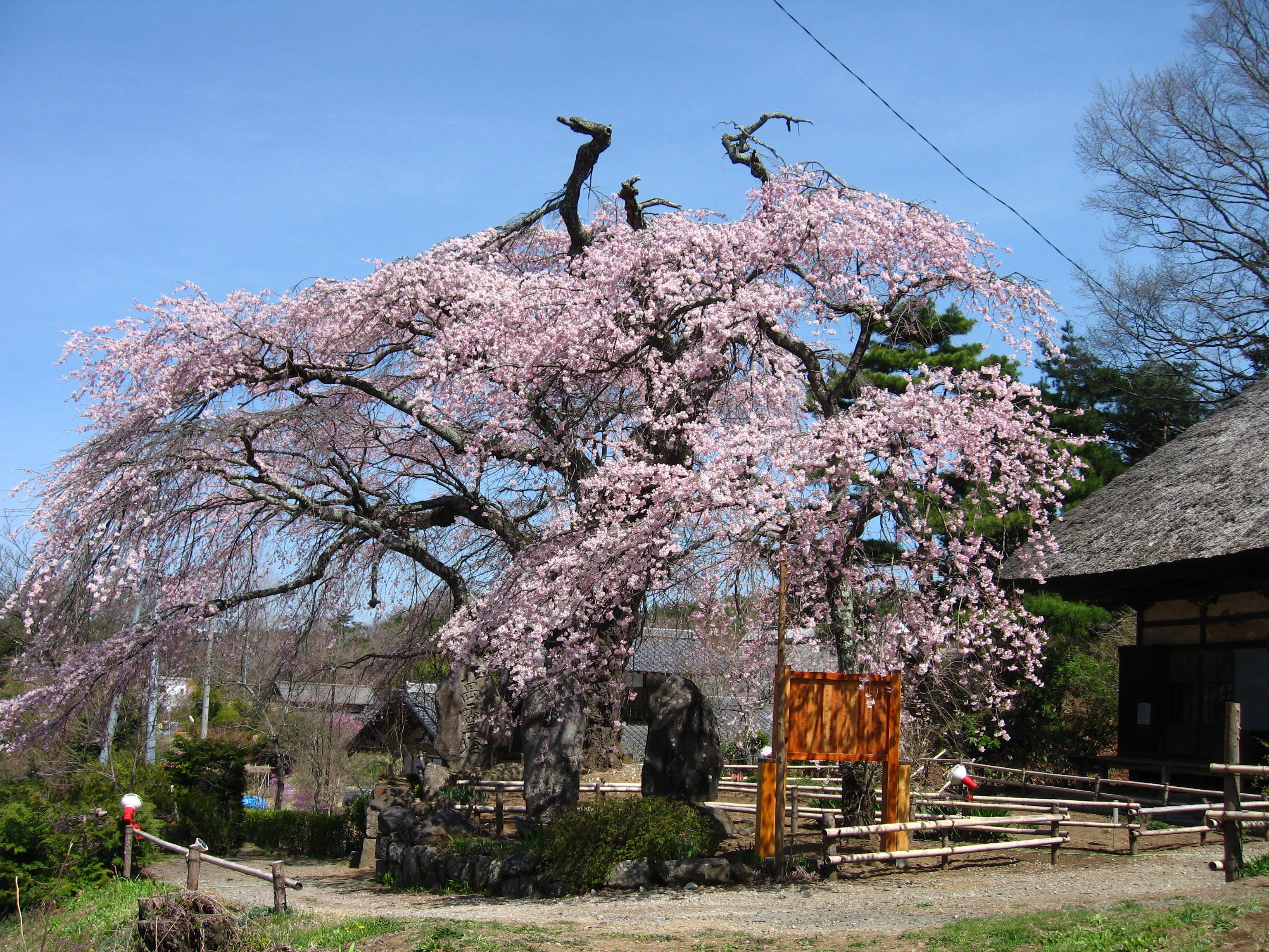 「高森観音堂のしだれ桜」は樹齢250年といわれ、茅葺き屋根にこぼれるように咲く桜は、はかなく美しく富士見町内一と讃えられています。