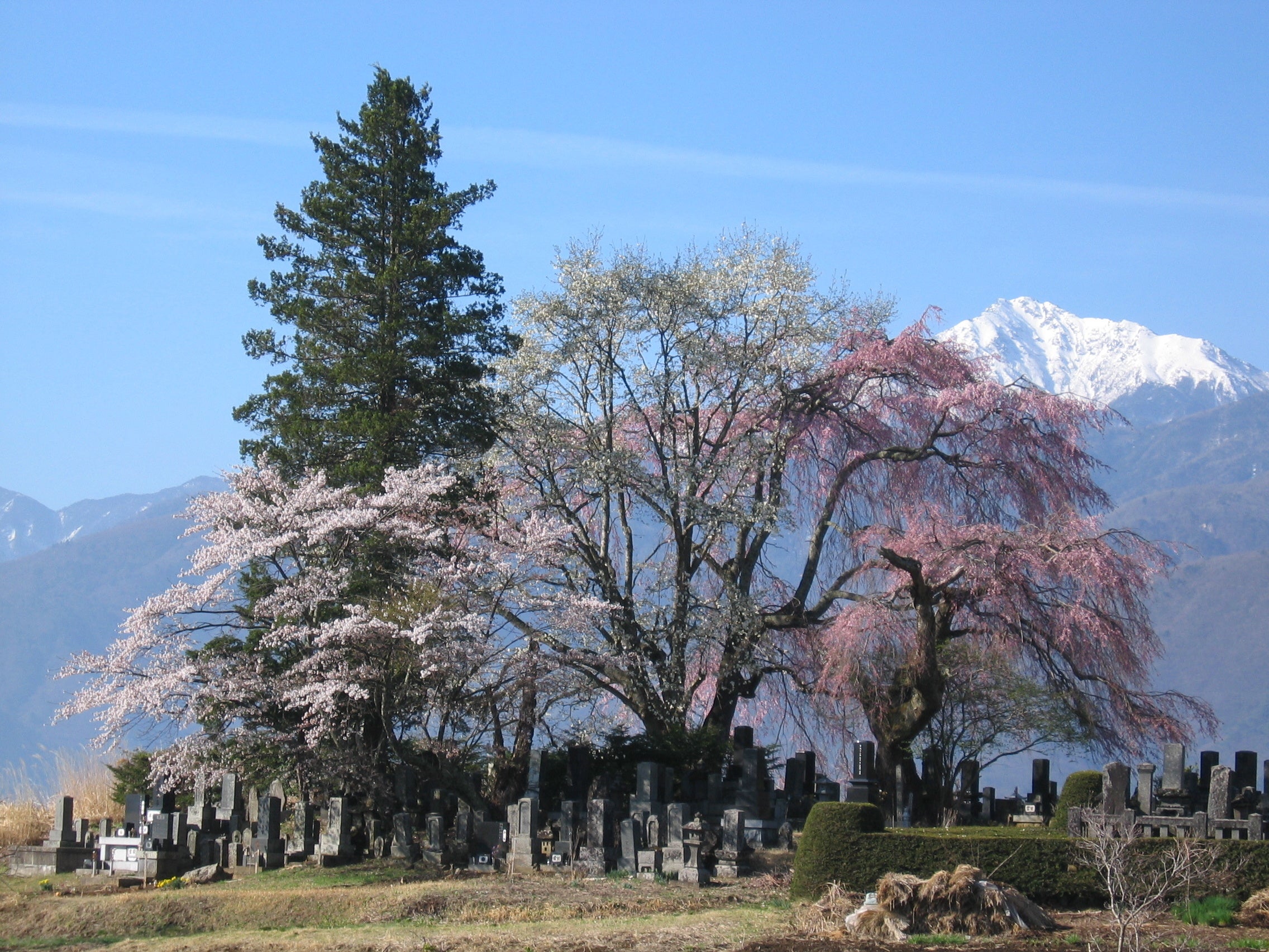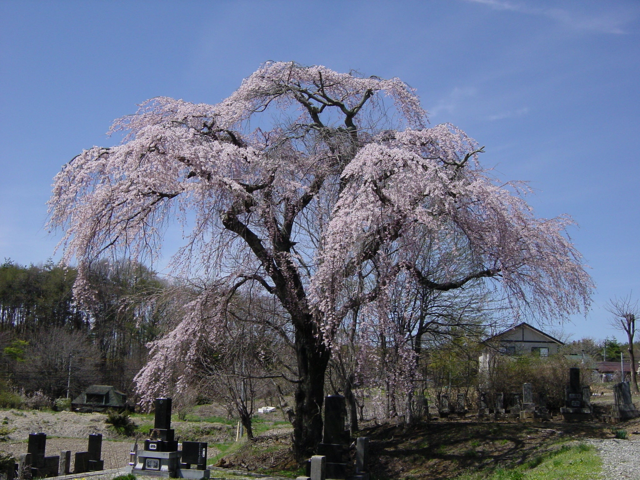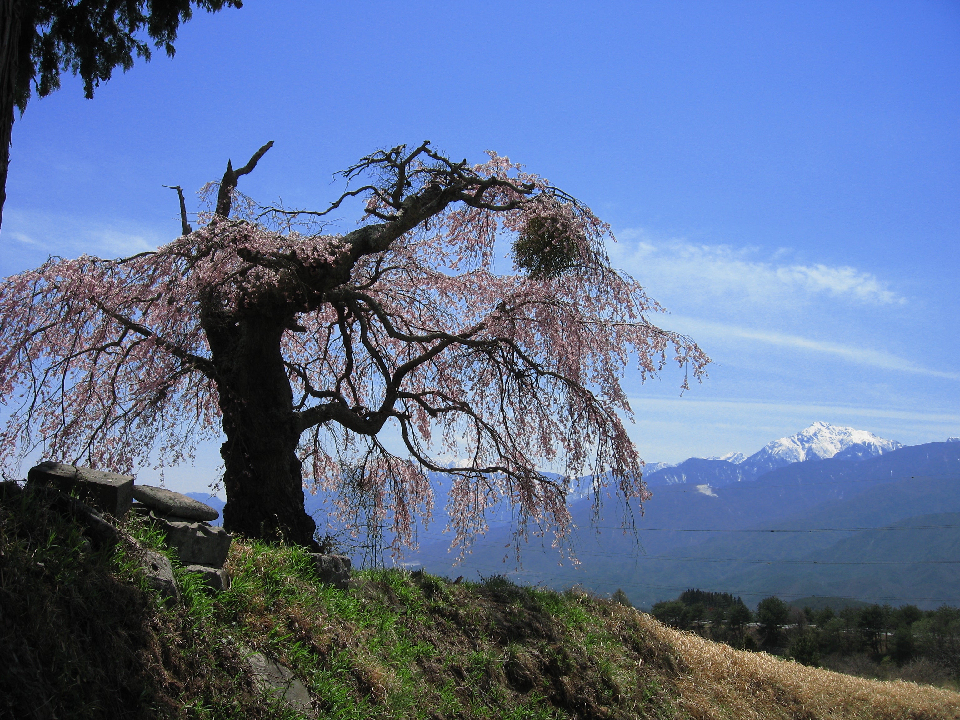 「高森観音堂のしだれ桜」は樹齢250年といわれ、茅葺き屋根にこぼれるように咲く桜は、はかなく美しく富士見町内一と讃えられています。